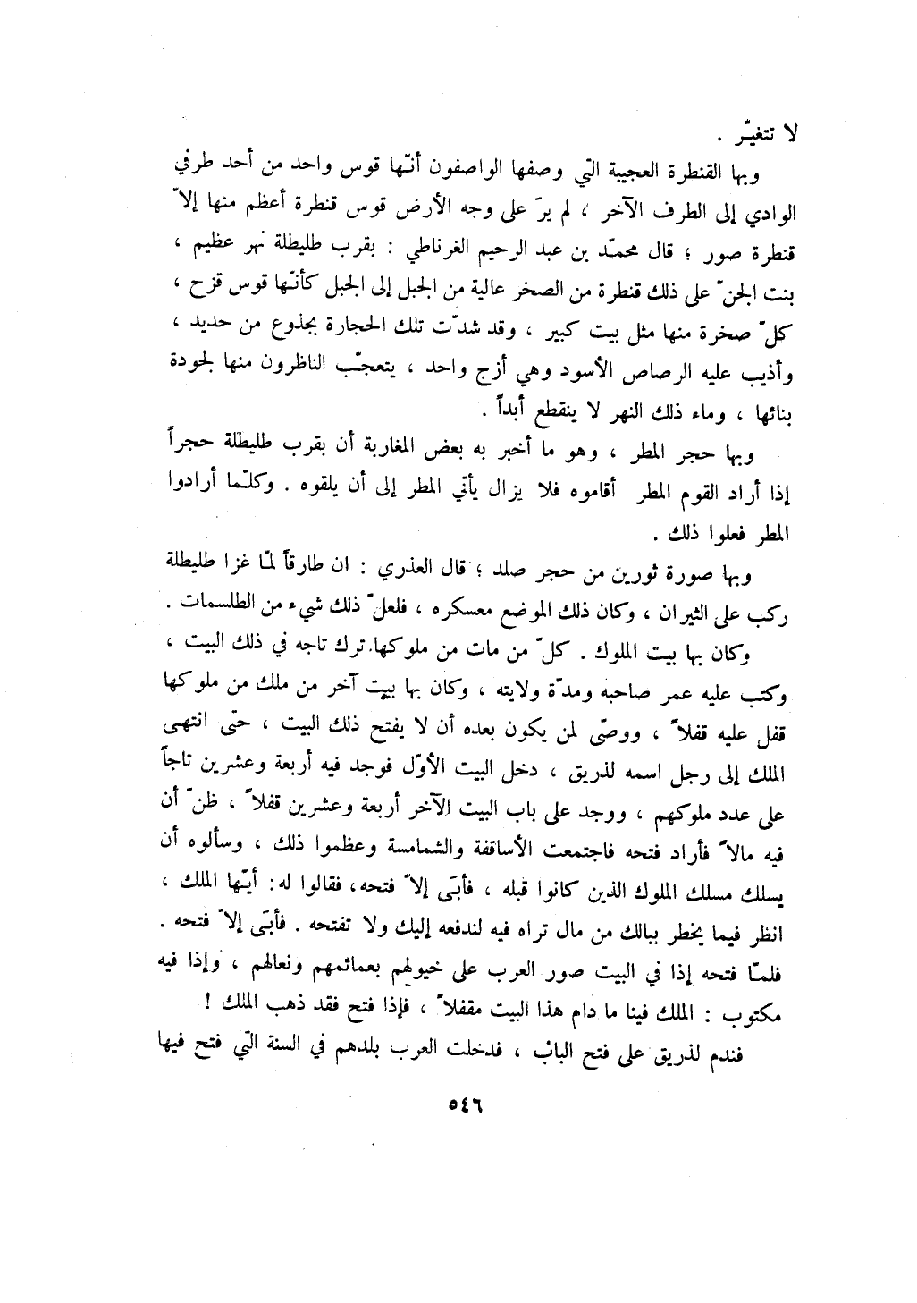 وبها القنطرة العجيبة التي وصفها الواصفون أنها قوس واحد من أحد طرفي الوادي إلى الطرف الآخر، لم ير على وجه الأرض قوس قنطرة أعظم منها إلا قنطرة صور؛ قال محمد بن عبد الرحيم الغرناطي: بقرب طليطلة نهر عظيم، بنت الجن على ذلك قنطرة من الصخر عالية من الجبل إلى الجبل كأنها قوس قزح، كل صخرة منها مثل بيت كبير، وقد شدت تلك الحجارة بجذوع من حديد، وأذيب عليه الرصاص الأسود وهي أزج واحد، يتعجب الناظرون منها لجودة بنائها، وماء ذلك النهر لا ينقطع أبداً.