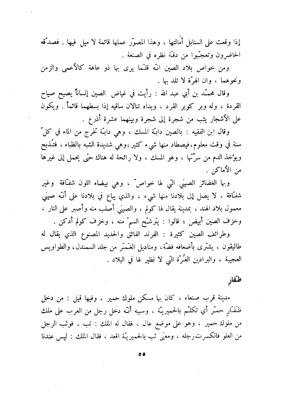 وقال ابن الفقيه: بالصين دابة المسك، وهي دابة تخرج من الماء في كل سنة في وقت معلوم، فيصطاد منها شي كثير، وهي شديدة الشبه بالظباء، فتذبح ويؤخذ الدم من سرتها، وهو المسك، ولا رائحة له هناك حتى يحمل إلى غيرها من الأماكن.