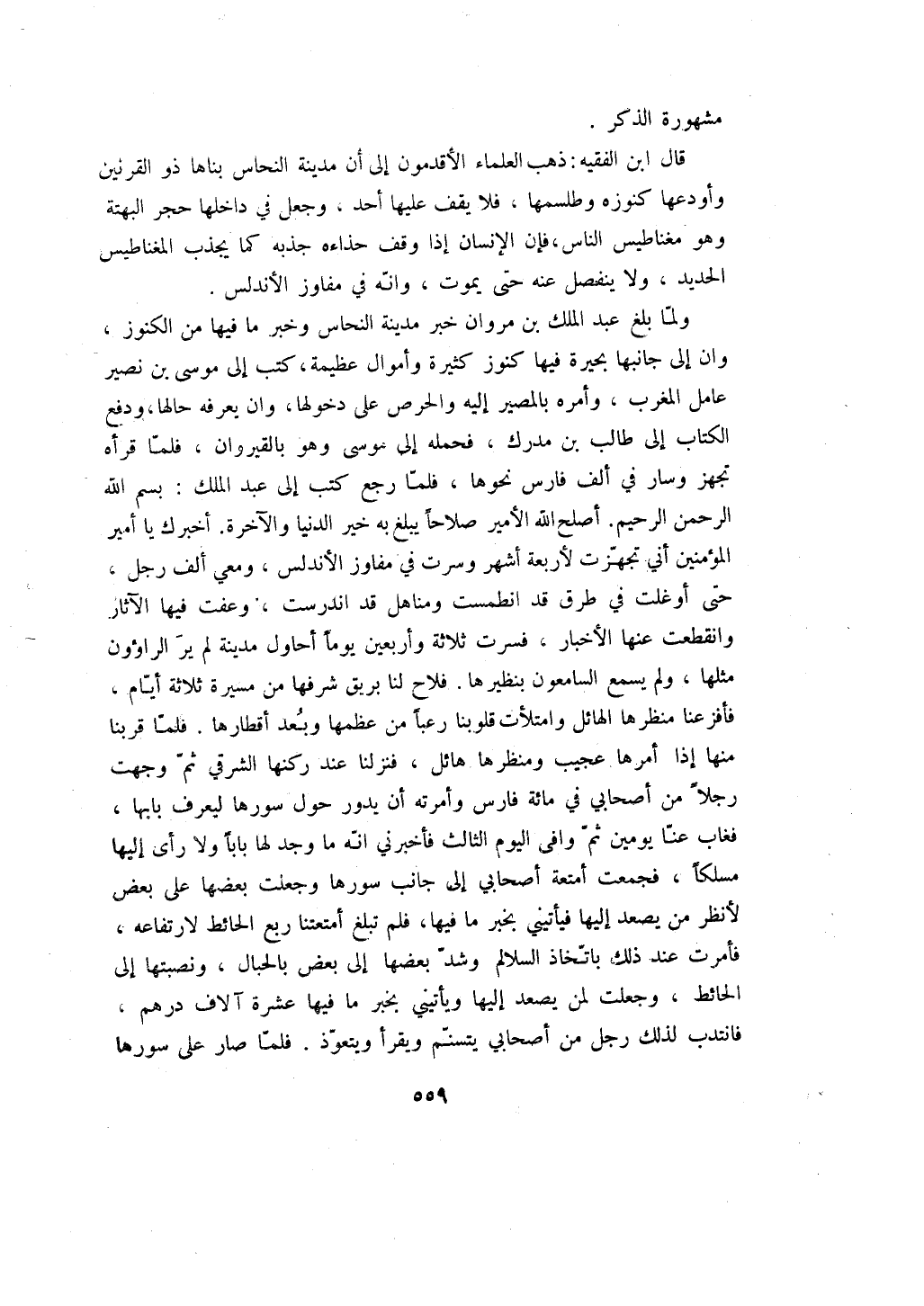 ولما بلغ عبد الملك بن مروان خبر مدينة النحاس وخبر ما فيها من الكنوز، وان إلى جانبها بحيرة فيها كنوز كثيرة وأموال عظيمة، كتب إلى موسى بن نصير عامل المغرب، وأمره بالمصير إليه والحرص على دخولها، وان يعرفه حالها، ودفع الكتاب إلى طالب بن مدرك، فحمله إلى موسى وهو بالقيروان، فلما قرأه تجهز وسار في ألف فارس نحوها، فلما رجع كتب إلى عبد الملك: بسم الله الرحمن الرحيم. أصلح الله الأمير صلاحاً يبلغ به خير الدنيا والآخرة. أخبرك يا أمير المؤمنين أني تجهزت لأربعة أشهر وسرت في مفاوز الأندلس، ومعي ألف رجل، حتى أوغلت في طرق قد انطمست ومناهل قد اندرست، وعفت فيها الآثار وانقطعت عنها الأخبار، فسرت ثلاثة وأربعين يوماً أحاول مدينة لم ير الراؤون مثلها، ولم يسمع السامعون بنظيرها. فلاح لنا بريق شرفها من مسيرة ثلاثة أيام، فأفزعنا منظرها الهائل وامتلأت قلوبنا رعباً من عظمها وبعد أقطارها. فلما قربنا منها إذا أمرها عجيب ومنظرها هائل، فنزلنا عند ركنها الشرقي ثم وجهت رجلاً من أصحابي في مائة فارس وأمرته أن يدور حول سورها ليعرف بابها، فغاب عنا يومين ثم وافى اليوم الثالث فأخبرني انه ما وجد لها باباً ولا أرى إليها مسلكاً، فجمعت أمتعة أصحابي إلى جانب سورها وجعلت بعضها على بعض لأنظر من يصعد إليها فيأتيني بخبر ما فيها، فلم تبلغ أمتعتنا ربع الحائط لارتفاعه، فأمرت عند ذلك باتخاذ السلالم وشد بعضها إلى بعض بالحبال، ونصبتها إلى الحائط، وجعلت لمن يصعد إليها ويأتيني بخبر ما فيها عشرة آلاف درهم، فانتدب لذلك رجل من أصحابي يتسنم ويقرأ ويتعوذ. فلما صار على سورها