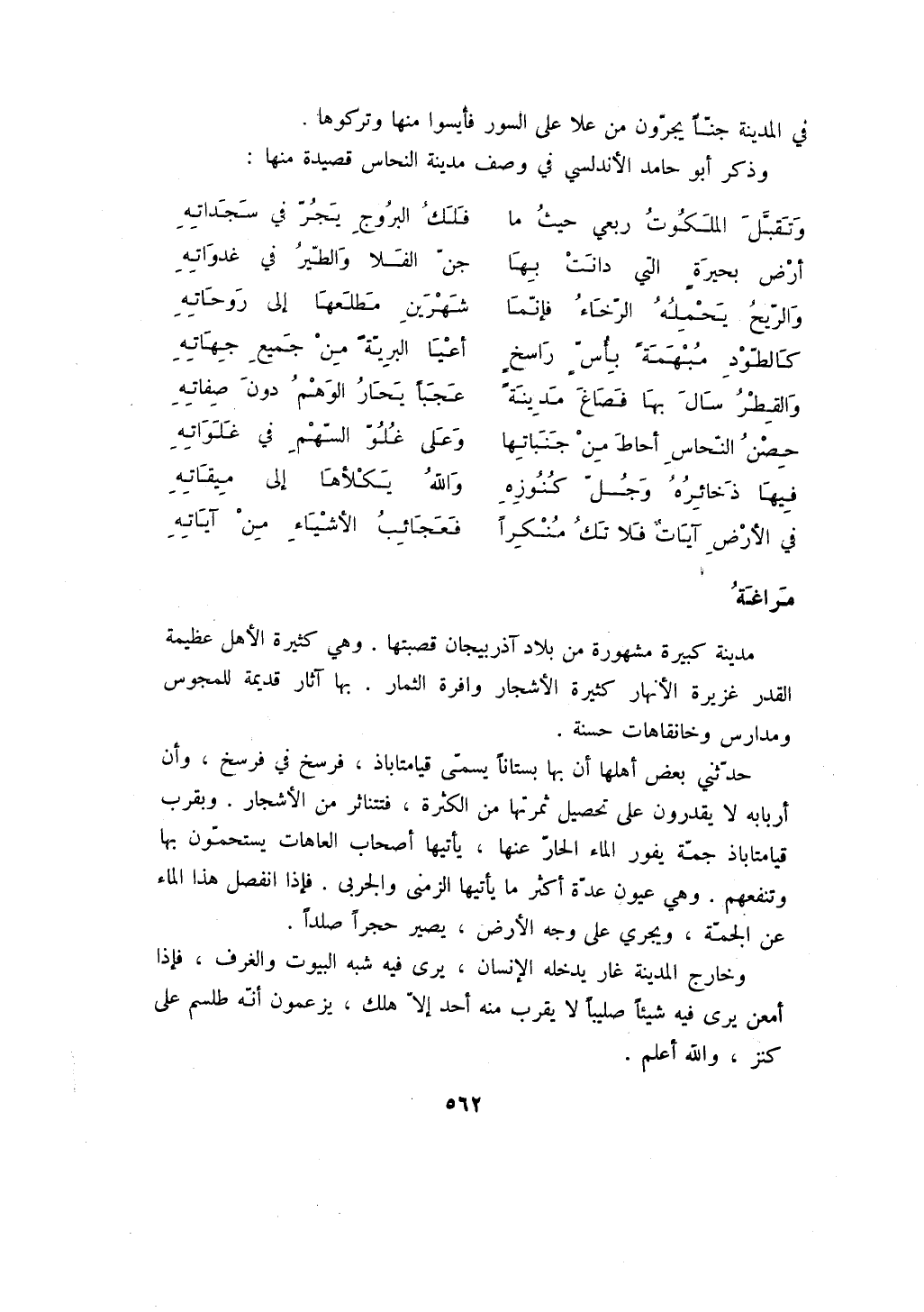 وذكر أبو حامد الأندلسي في وصف مدينة النحاس قصيدة منها: