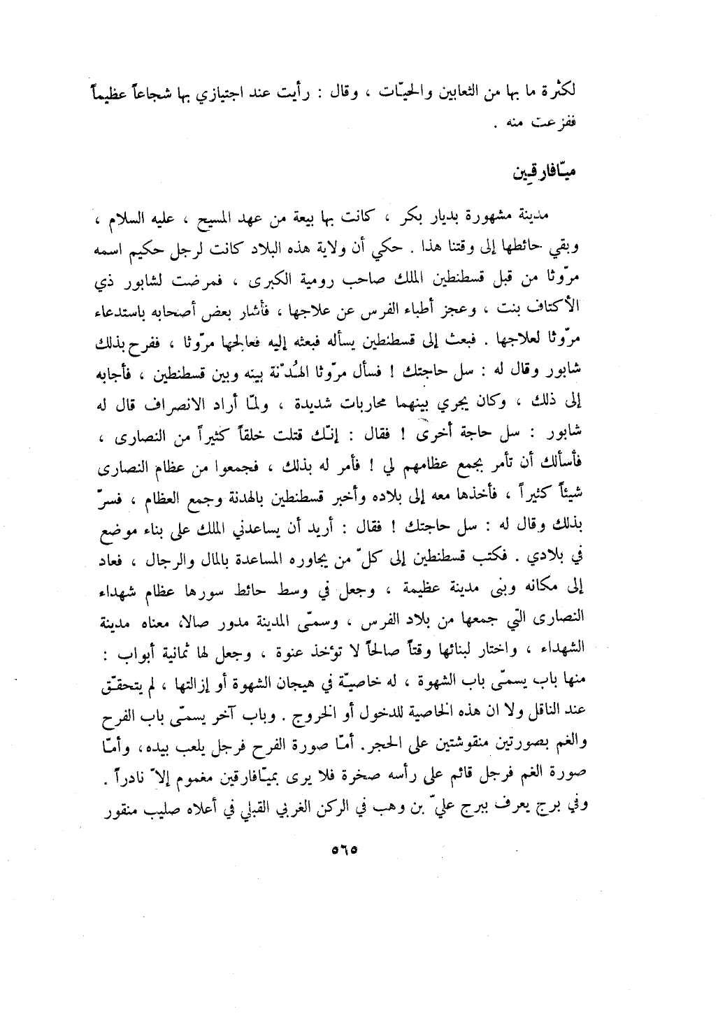مدينة مشهورة بديار بكر، كانت بها بيعة من عهد المسيح، عليه السلام، وبقي حائطها إلى وقتنا هذا. حكي أن ولاية هذه البلاد كانت لرجل حكيم اسمه مروثا من قبل قسطنطين الملك صاحب رومية الكبرى، فمرضت لشابور ذي الأكتاف بنت، وعجز أطباء الفرس عن علاجها، فأشار بعض أصحابه باستدعاء مروثا لعلاجها. فبعث إلى قسطنطين يسأله فبعثه إليه فعالجها مروثا، ففرح بذلك شابور وقال له: سل حاجتك! فسأل مروثا الهدنة بينه وبين قسطنطين، فأجابه إلى لك، وكان يجري بينهما محاربات شديدة، ولما أراد الانصراف قال له شابور: سل حاجة أخرى! فقال: إنك قتلت خلقاً كثيراً من النصارى، فأسألك أن تأمر بجمع عظامهم لي! فأمر له بذلك، فجمعوا من عظام النصارى شيئاً كثيراً، فأخذها معه إلى بلاده وأخبر قسطنطين بالهدنة وجمع العظام، فسر بذلك وقال له: سل حاجتك! فقال: أريد أن يساعدني الملك على بناء موضع في بلادي. فكتب قسطنطين إلى كل من يجاوره المساعدة بالمال والرجال، فعاد إلى مكانه وبنى مدينة عظيمة، وجعل في وسط حائط سورها عظام شهداء النصارى التي جمعها من بلاد الفرس، وسمى المدينة مدور صالا، معناه مدينة الشهداء، واختار لبنائها وقتاً صالحاً لا تؤخذ عنوة، وجعل لها ثمانية أبواب: منها باب يسمى باب الشهوة، له خاصية في هيجان الشهوة أو إزالتها، لم يتحقق عند الناقل ولا ان هذه الخاصية للدخول أو الخروج. وباب آخر يسمى باب الفرح والغم بصورتين منقوشتين على الحجر. أما صورة الفرح فرجل يلعب بيده، وأما صورة الغم فرجل قائم على رأسه صخرة فلا يرى بميافارقين مغموم إلا نادراً. وفي برج يعرف ببرج علي بن وهب في الركن الغربي القبلي في أعلاه صليب منقور