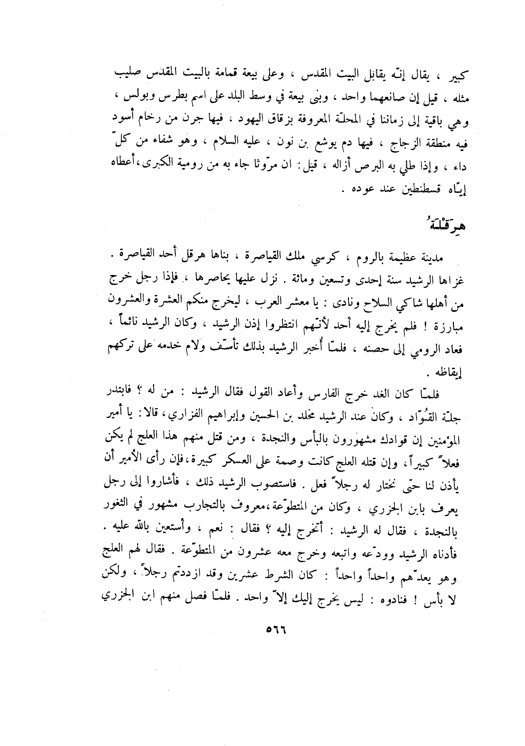 فلما كان الغد خرج الفارس وأعاد القول فقال الرشيد: من له؟ فابتدر جلة القواد، وكان عند الرشيد مخلد بن الحسين وإبراهيم الفزاري، قالا: يا أمير المؤمنين إن قوادك مشهورون بالبأس والنجدة، ومن قتل منهم هذا العلج لم يكن فعلاً كبيراً، وإن قتله العلج كانت وصمة على العسكر كبيرة، فإن رأى الأمير أن يأذن لنا حتى نختار له رجلاً فعل. فاستصوب الرشيد ذلك، فأشاروا إلى رجل يعرف بابن الجزري، وكان من المتطوعة، معروف بالتجارب مشهور في الثغور بالنجدة، فقال له الرشيد: أتخرج إليه؟ فقال: نعم، وأستعين بالله عليه. فأدناه الرشيد وودعه واتبه وخرج معه عشرون من المتطوعة. فقال لهم العلج وهو يعدهم واحداً واحداً: كان الشرط عشرين وقد ازددتم رجلاً، ولكن لا بأس! فنادوه: ليس يخرج إليك إلا واحد. فلما فصل منهم ابن الجزري