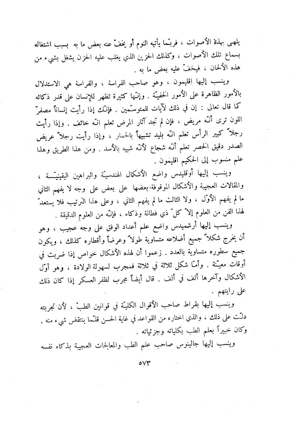 وينسب إليها أوقليدس واضع الأشكال الهندسية والبراهين اليقينية، والمقالات العجيبة والأشكال الموقوفة. بعضها على بعض على وجه لا يفهم الثاني ما لم يفهم الأول، ولا الثالث ما لم يفهم الثاني، وعلى هذا الترتيب فلا يستعد لهذا الفن من العلوم إلا كل ذي فطانة وذكاء، فإنه من العلوم الدقيقة.