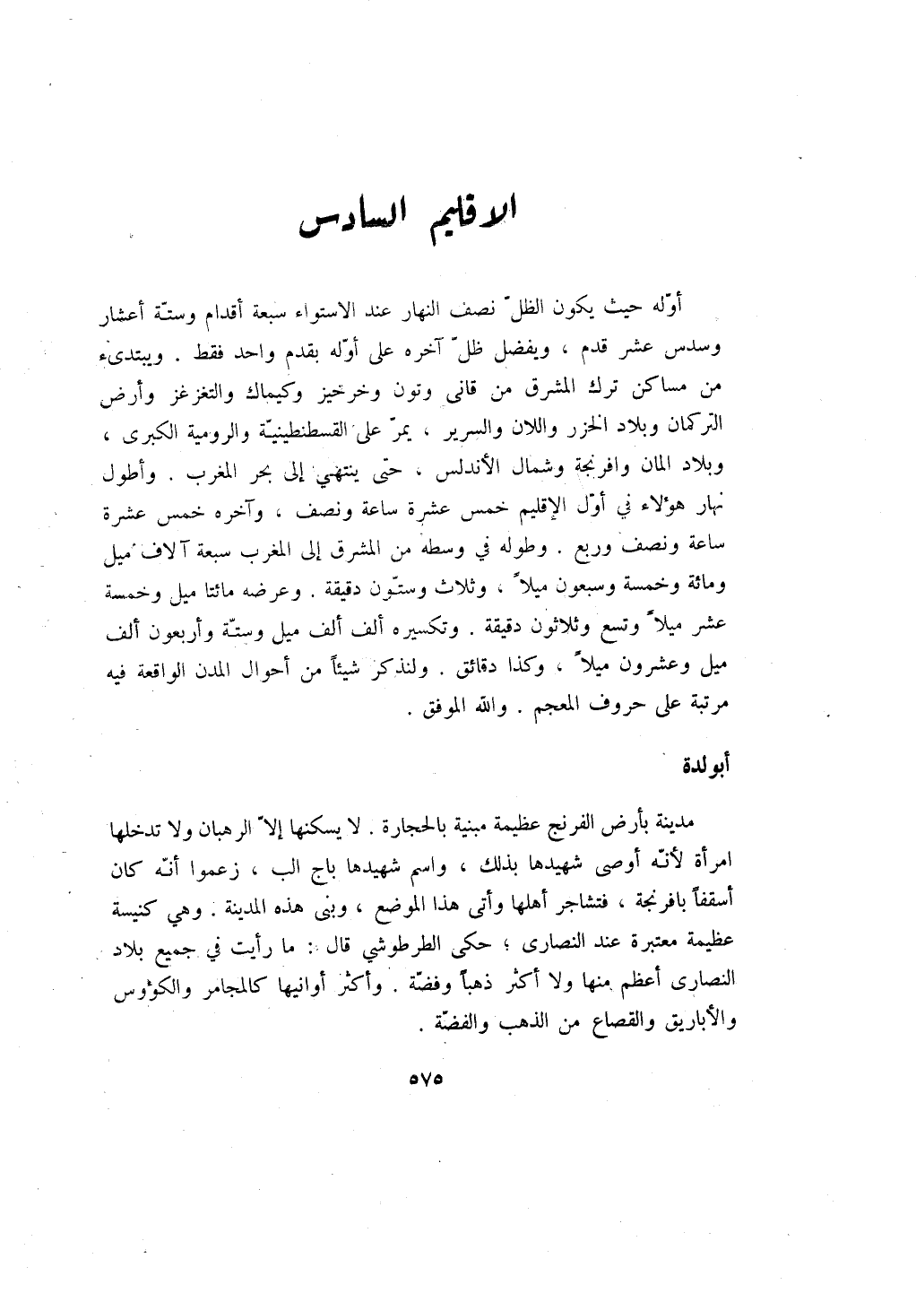 أوله حيث يكون الظل نصف النهار عند الاستواء سبعة أقدام وستة أعشار وسدس عشر قدم، ويفضل ظل آخره على أوله بقدم واحد فقط. ويبتديء من مساكن ترك المشرق من قانى وتون وخرخيز وكيماك والتغزغز وأرض التركمان وبلاد الخزر واللان والسرير، يمر على القسطنطينية والرومية الكبرى، وبلاد المان وافرنجة وشمال الأندلس، حتى ينتهي إلى بحر المغرب، وأطول نهار هؤلاء في أول الإقليم خمس عشرة ساعة ونصف، وآخره خمس عشرة ساعة ونصف وربع. وطوله في وسطه من المشرق إلى المغرب سبعة آلاف ميل ومائة وخمسة وسبعون ميلاً، وثلاث وستون دقيقة. وعرضه مائتا ميل وخمسة عشر ميلاً وتسع وثلاثون دقيقة. وتكسيره ألف ألف ميل وستة وأربعون ألف ميل وعشرون ميلاً، وكذا دقائق. ولنذكر شيئاً من أحوال المدن الواقعة فيه مرتبة على حروف المعجم. والله الموفق.