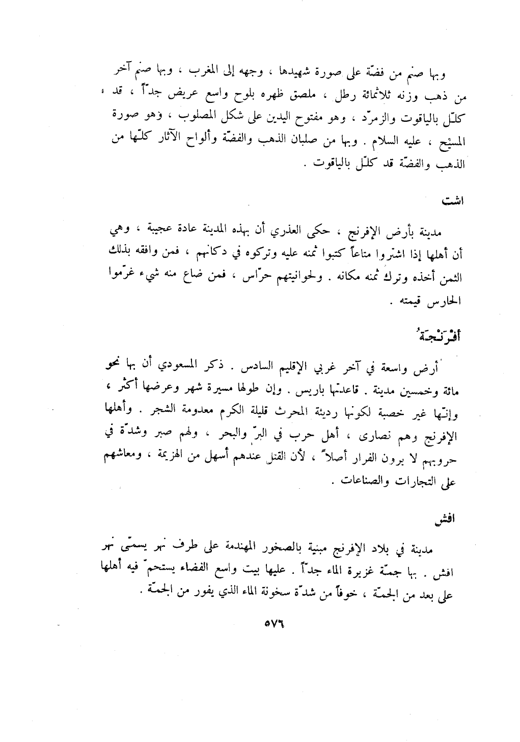 أرض واسعة في آخر غربي الإقليم السادس. ذكر المسعودي أن بها نحو مائة وخمسين مدينة. قاعدتها باريس. وإن طولها مسيرة شهر وعرضها أكثر، وإنها غير خصبة لكونها رديئة المحرث قليلة الكرم معدومة الشجر. وأهلها الإفرنج وهم نصارى، أهل حرب في البر والبحر، ولهم صبر وشدة في حروبهم لا يرون الفرار أصلاً، لأن القتل عندهم أسهل من الهزيمة، ومعاشهم على التجارات والصناعات.