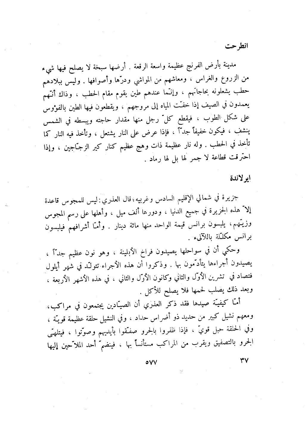 مدينة بأرض الفرنج عظيمة واسعة الرقعة. أرضها سبخة لا يصلح فيها شيء من الزروع والغراس، ومعاشهم من المواشي ودرها وأصوافها. وليس ببلادهم حطب يشعلونه بحاجاتهم، وإنما عندهم طين يقوم مقام الحطب، وذاك أنهم يعمدون في الصيف إذا خفت المياه إلى مروجهم، ويقطعون فيها الطين بالفؤوس على شكل الطوب، فيقطع كل رجل منها مقدار حاجته ويبسطه في الشمس ينشف، فيكون خفيفاً جداً، فإذا عرض على النار يشتعل، وتأخذ فيه النار كما تأخذ في الحطب. وله نار عظيمة ذات وهج عظيم كنار كير الزجاجين، وإذا احترقت قطاعة لا جمر لها بل لها رماد.