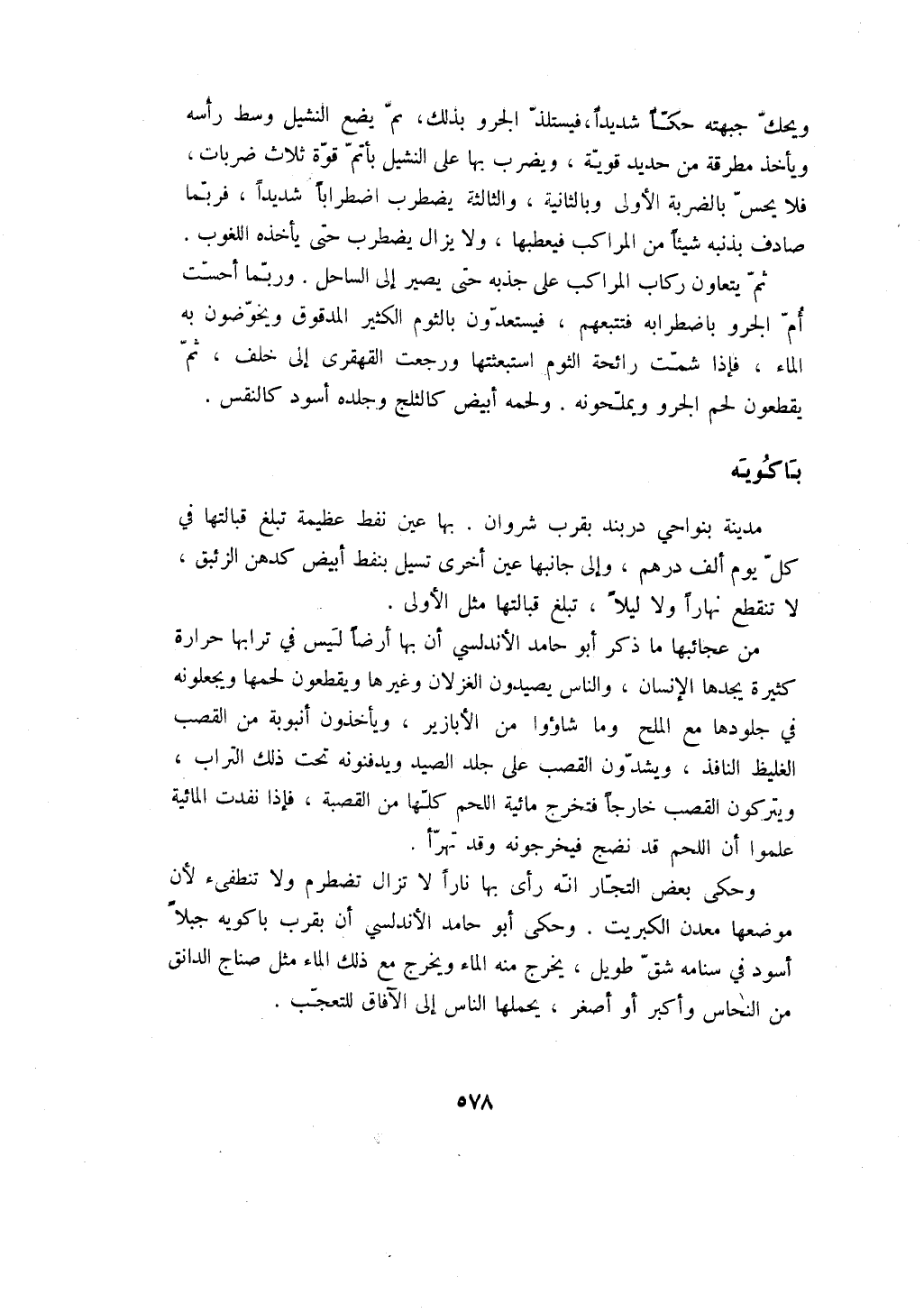 وحكى بعض التجار انه رأى بها ناراً لا تزال تضطرم ولا تنطفيء لأن موضعها معدن الكبريت. وحكى أبو حامد الأندلسي أن بقر باكويه جبلاً أسود في سنامه شق طويل، يخرج منه الماء ويخرج مع ذلك الماء مثل صناج الدانق من النحاس وأكبر أو أصغر، يحملها الناس إلى الآفاق للتعجب.