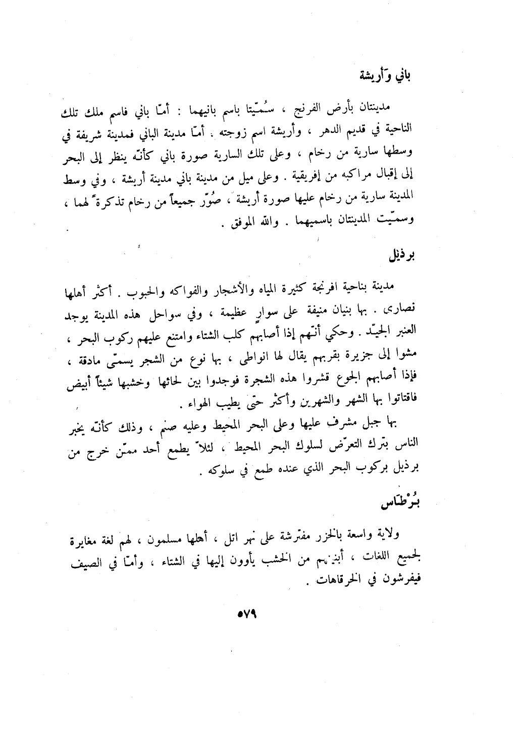 مدينتان بأرض الفرنج، سميتا باسم بانيهما: أما باني فاسم ملك تلك الناحية في قديم الدهر، وأريشة اسم زوجته. أما مدينة الباني فمدينة شريفة في وسطها سارية من رخام، وعلى تلك السارية صورة باني كأنه ينظر إلى البحر إلى إقبال مراكبه من إفريقية. وعلى ميل من مدينة باني مدينة أريشة، وفي وسط المدينة سارية من رخام عليها صورة أريشة، صور جميعاً من رخام تذكرةً لهما، وسميت المدينتان باسميهما. والله الموفق.