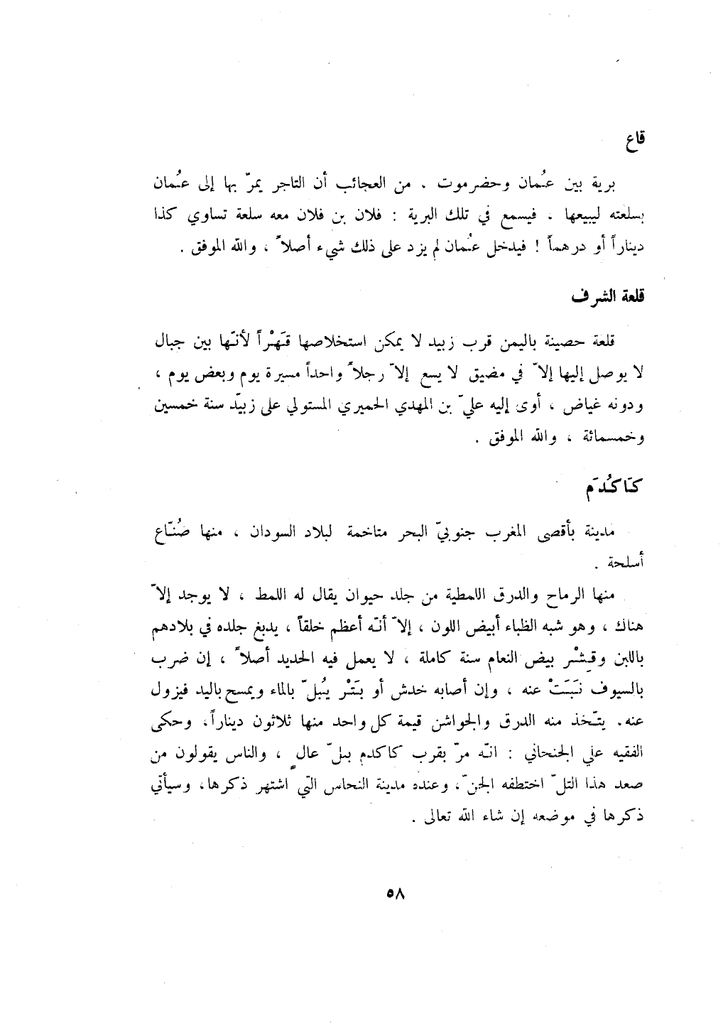 برية بين عمان وحضرموت، من العجائب أن التاجر يمر بها إلى عمان بسلعته ليبيعها، فيسمع في تلك البرية: فلان بن فلان معه سلعة تساوي كذا ديناراً أو درهماً! فيدخل عمان لم يزد على ذلك شيء أصلاً، والله الموفق.