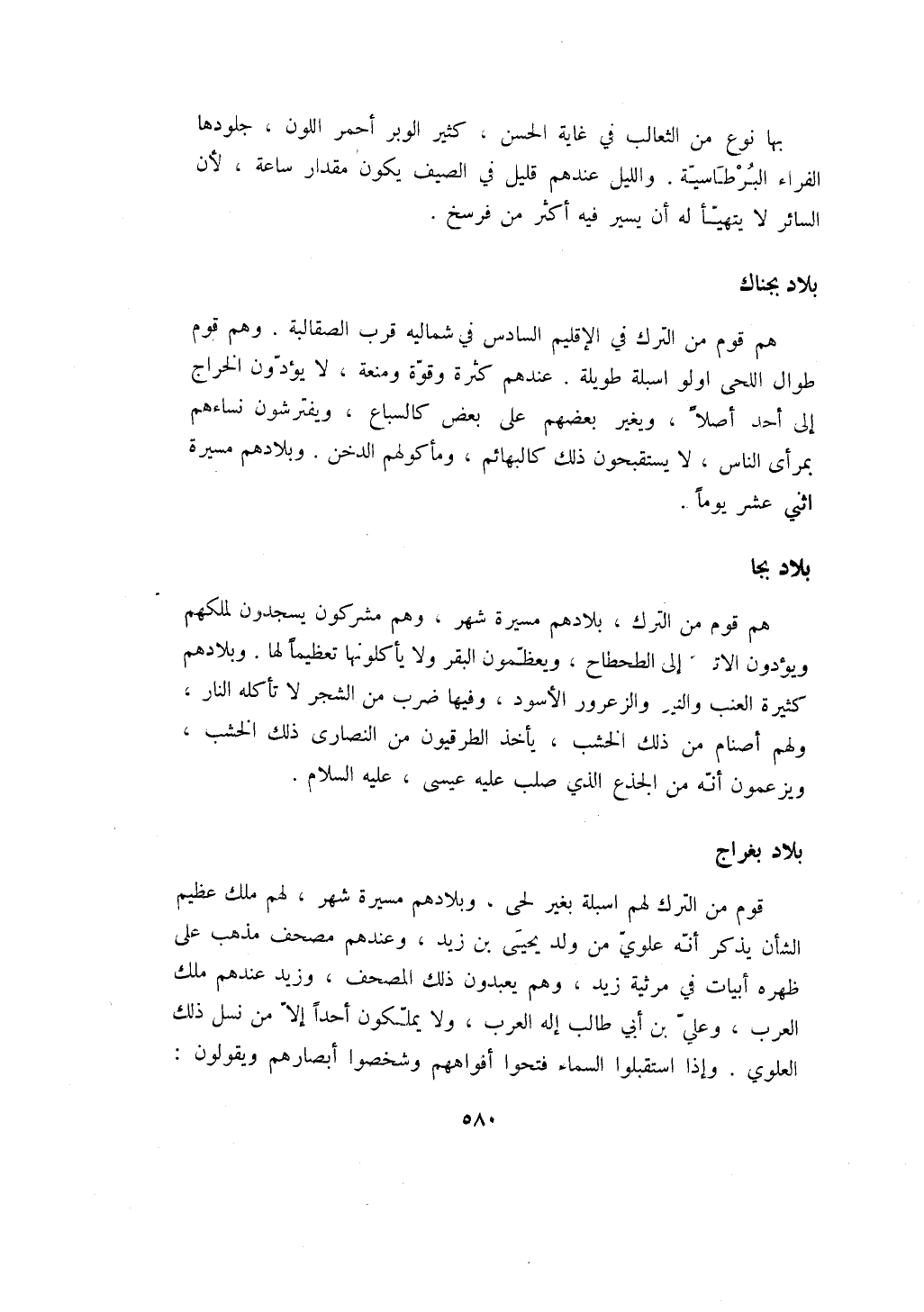 قوم من الترك لهم اسبلة بغير لحى، وبلادهم مسيرة شهر، لهم ملك عظيم الشأن يذكر أنه علوي من ولد يحيى بن زيد، وعندهم مصحف مذهب على ظهره أبيات في مرثية زيد، وهم يعبدون ذلك المصحف، وزيد عندهم ملك العرب، وعلي بن أبي طالب إله العرب، ولا يملكون أحداً إلا من نسل ذلك العلوي. وإذا استقبلوا السماء فتحوا أفواههم وشخصوا أبصارهم ويقولون: