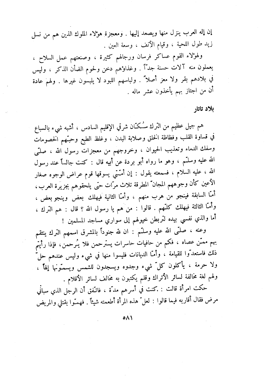 هم جيل عظيم من الترك سكان شرقي الإقليم السادس، أشبه شيء بالسباع في قساوة القلب وفظاظة الخلق وصلابة البدن، وغلظ الطبع وحبهم الخصومات وسفك الدماء وتعذيب الحيوان، وخروجهم من معجزات رسول الله، صلى الله عليه وسلم، وهو ما رواه أبو بردة عن أبيه قال: كنت جالساً عند رسول الله، عليه السلام، فسمعته يقول: إن أمتي يسوقها قوم عراض الوجوه صغار الأعين كأن وجوههم المجان المطرقة ثلاث مرات حتى يلحقوهم بجزيرة العرب، أما السابقة فينجو من هرب منهم، وأما الثانية فيهلك بعض وينجو بعض، وأما الثالثة فيهلك كلهم. قالوا: من هم يا رسول الله؟ قال: هم الترك، أما والذي نفسي بيده لتربطن خيولهم إلى سواري مساجد المسلمين! وعنه، صلى الله عليه وسلم: ان لله جنوداً بالمشرق اسمهم الترك ينتقم بهم ممن عصاه، فكم من حافيات حاسرات يسترحمن فلا يرحمن، فإذا رأيتم ذلك فاستعدوا للقيامة، وأما الديانات فليسوا منها في شيء وليس عندهم حل ولا حرمة، يأكلون كل شيء وجدوه ويسجدون للشمس ويسمونها إلهاً، ولهم لغة مخالفة لسائر الأتراك وقلم يكتبون به مخالف لسائر الأقلام.