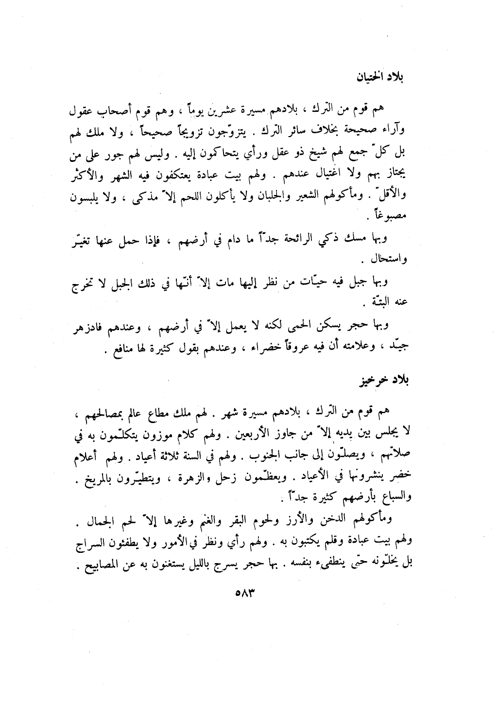 هم قوم من الترك، بلادهم مسيرة عشرين يوماً، وهم قوم أصحاب عقول وآراء صحيحة بخلاف سائر الترك. يتزوجون تزويجاً صحيحاً، ولا ملك لهم بل كل جمع لهم شيخ ذو عقل ورأي يتحاكمون إليه. وليس لهم جور على من يجتاز بهم ولا اغتيال عندهم. ولهم بيت عبادة يعتكفون فيه الشهر والأكثر والأقل. ومأكولهم الشعير والجلبان ولا يأكلون اللحم إلا مذكى، ولا يلبسون مصبوغاً.