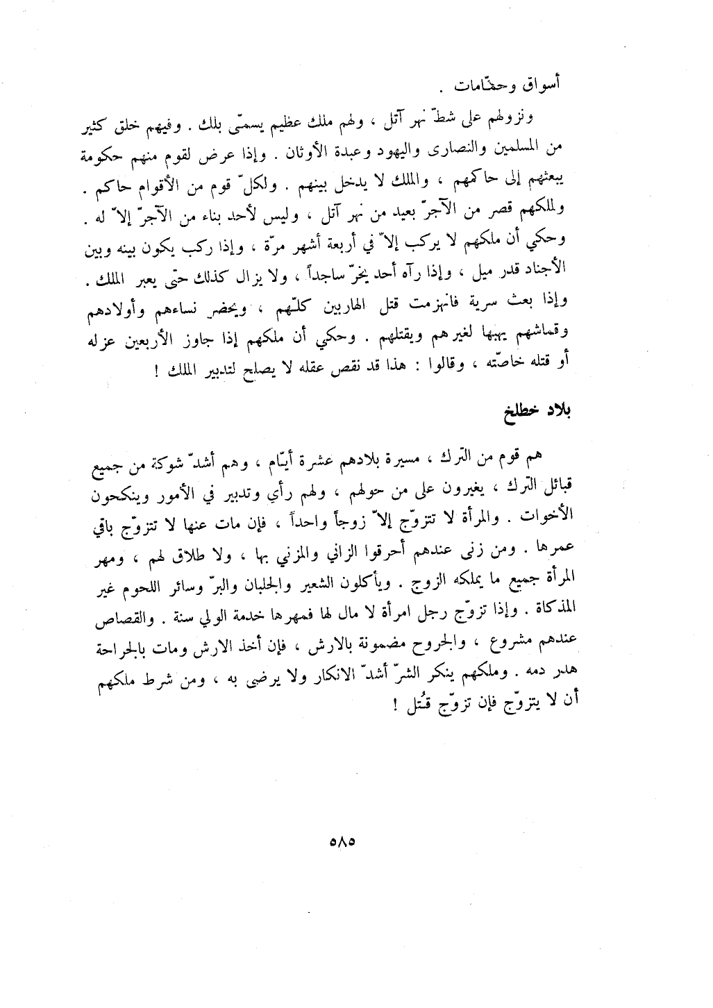 ونزولهم على شط نهر آتل، ولهم ملك عظيم يسمى بلك. وفيهم خلق كثير من المسلمين والنصارى واليهود وعبدة الأوثان. وإذا عرض لقوم منهم حكومة يبعثهم إلى حاكمهم، والملك لا يدخل بينهم. ولكل قوم من الأقوام حاكم. ولملكهم قصر من الآجر بعيد من نهر آتل، وليس لأحد بناء من الآجر إلا له. وحكي أن ملكهم لا يركب إلا في أربعة أشهر مرة، وإذا ركب يكون بينه وبين الأجناد قدر ميل، وإذا رآه أحد يخر ساجداً، ولا يزال كذلك حتى يعبر الملك. وإذا بعث سرية فانهزمت قتل الهاربين كلهم، ويحضر نساءهم وأولادهم وقماشهم يهبها لغيرهم ويقتلهم. وحكي ان ملكهم إذا جاوز الأربعين عزله أو قتله خاصته، وقالوا: هذا قد نقص عقله لا يصلح لتدبير الملك!