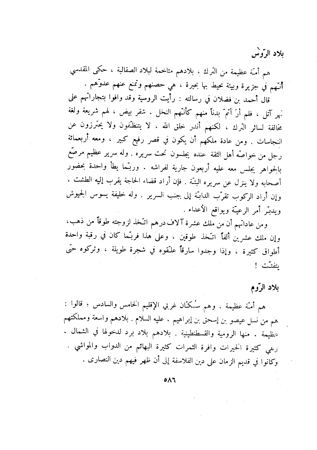 قال أحمد بن فضلان في رسالته: رأيت الروسية وقد وافوا بتجاراتهم على نهر آتل، فلم أر أتم بدناً منهم كأنهم النخل، شقر بيض، لهم شريعة ولغة مخالفة لسائر الترك، لكنهم أندر خلق الله، لا يتنظفون ولا يحترزون عن النجاسات. ومن عادة ملكهم أن يكون في قصر رفيع كبير، ومعه أربعمائة رجل من خواصه أهل الثقة عنده يجلسون تحت سريره. وله سري عظيم مرصع بالجواهر يجلس معه عليه أربعون جارية لفراشه، وربما يطأ واحدة بحضور أصحابه ولا ينزل عن سريره البتة. فإن أراد قضاء الحاجة يقرب إليه الطشت، وإن أراد الركوب تقرب الدابة إلى جنب السرير، وله خليفة يسوس الجيوش ويدبر أمر الرعية ويواقع الأعداء.