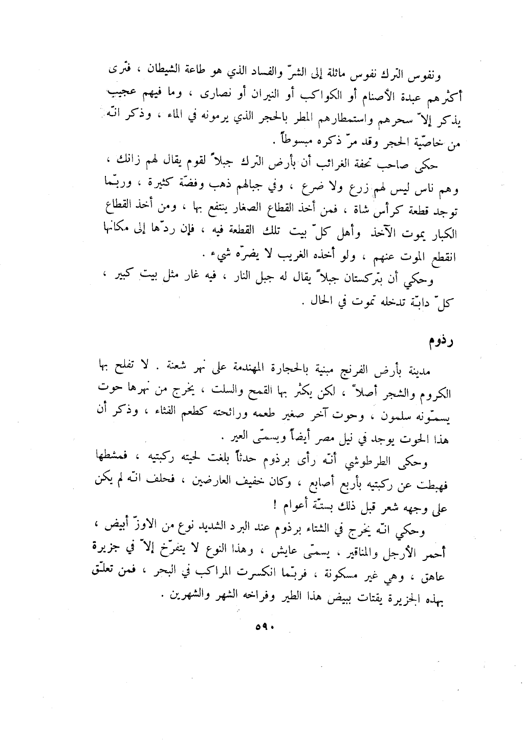 ونفوس الترك نفوس مائلة إلى الشر والفساد الذي هو طاعة الشيطان، فترى أكثرهم عبدة الأصنام أو الكواكب أو النيران أو نصارى، وما فيهم عجيب يذكر إلا سحرهم واستمطارهم المطر بالحجر الذي يرمونه في الماء، وذكر انه من خاصية الحجر وقد مر ذكره مبسوطاً.