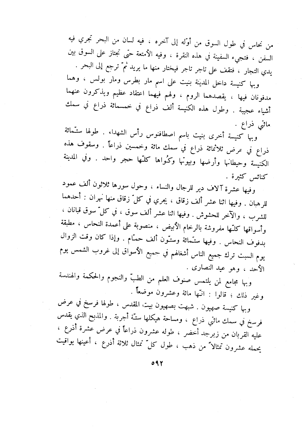 وفيها عشرة آلاف دير للرجال والنساء، وحول سورها ثلاثون ألف عمود للرهبان. وفيها اثنا عشر ألف زقاق، يجري في كل زقاق منها نهران: أحدهما للشرب، والآخر للحشوش. وفيها اثنا عشر ألف سوق، في كل سوق قبانان، وأسواقها كلها مفروشة بالرخام الأبيض، منصوبة على أعمدة النحاس، مطبقة بدفوف النحاس. وفيها ستمائة وستون ألف حمام. وإذا كان وقت الزوال يوم السبت ترك جميع الناس أشغالهم في جميع الأسواق إلى غروب الشمس يوم الأحد، وهو عيد النصارى.