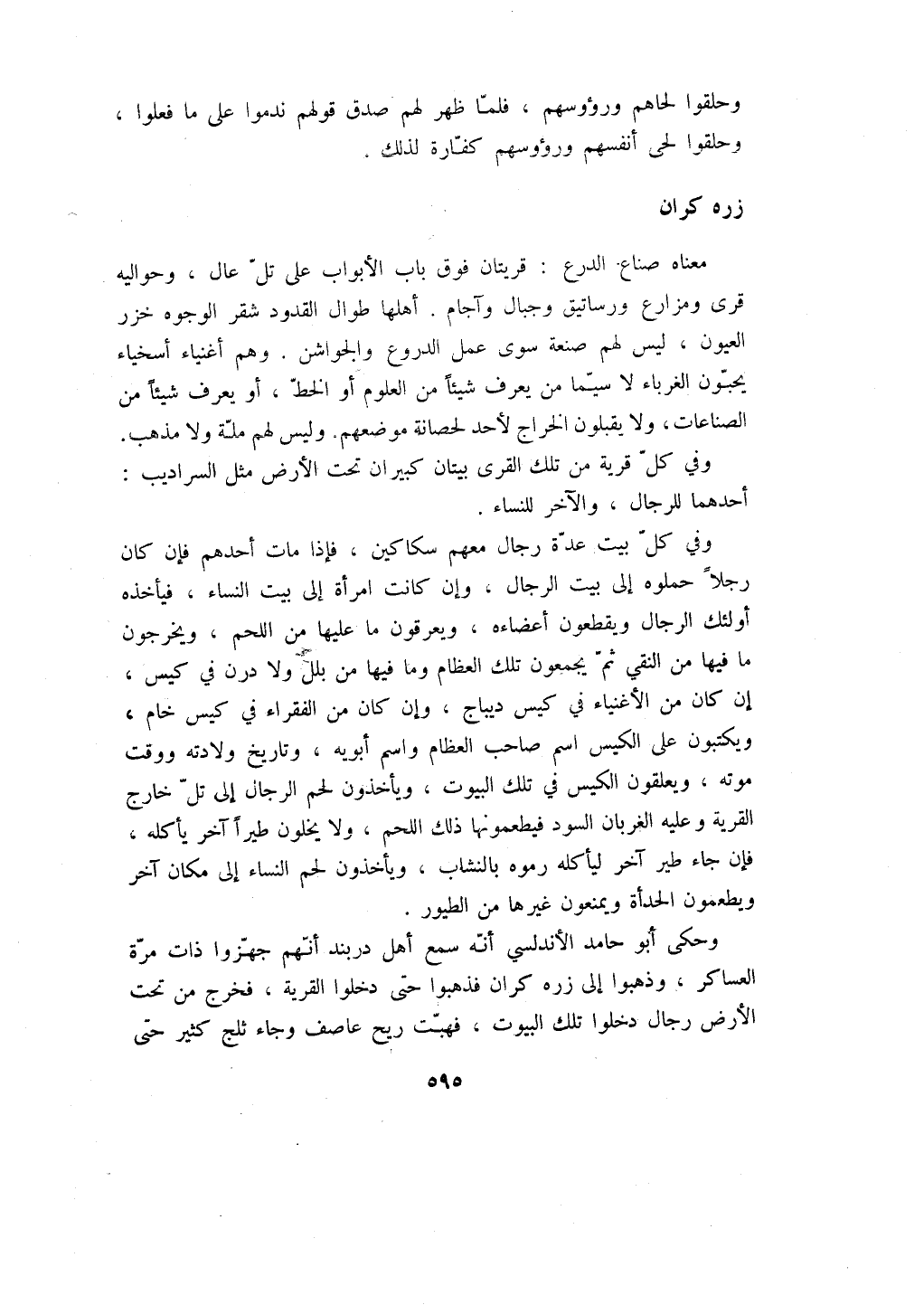 وحكى أبو حامد الأندلسي أنه سمع أهل دربند أنهم جهزوا ذات مرة العساكر، وذهبوا إلى زره كران فذهبوا حتى دخلوا القرية، فخرج من تحت الأرض رجال دخلوا تلك البيوت، فهبت ريح عاصف وجاء ثلج كثير حتى