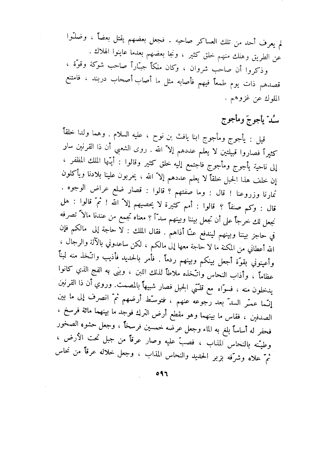 قيل: يأجوج ومأجوج ابنا يافث بن نوح، عليه السلام. وهما ولدا خلقاً كثيراً فصاروا قبيلتين لا يعلم عددهم إلا الله. روى الشعبي أن ذا القرنين سار إلى ناحية يأجوج ومأجوج فاجتمع إليه خلق كثير وقالوا: أيها الملك المظفر، إن خلف هذا الجبل خلقاً لا يعلم عددهم إلا الله، يخربون علينا بلادنا وياكلون ثمارنا وزروعنا! قال: وما صفتهم؟ قالوا: قصار ضلع عراض الوجوه. قال: وكم صنفاً؟ قالوا: أمم كثيرة لا يحصيهم إلا الله! ثم قالوا: هل نجعل لك خرجاً على أن تجعل بيننا وبينهم سداً؟ معناه تجمع من عندنا مالاً تصرفه في حاجز بيننا وبينهم ليندفع عنا أذاهم. فقال الملك: لا حاجة إلى مالكم فإن الله أعطاني من المكنة ما لا حاجة معها إلى مالكم، لكن ساعدوني بالآلة والرجال، وأعينوني بقوة أجعل بينكم وبينهم ردماً. فأمر بالحديد فأذيب واتخذ منه لبناً عظاماً، وأذاب النحاس واتخذه ملاطاً لذلك اللبن، وبنى به الفج الذي كانوا يدخلون منه، فسواه مع قلتي الجبل فصار شبيهاً بالمصمت. وروي أن ذا القرنين إنما عمر السد بعد رجوعه عنهم، فتوسط أرضهم ثم انصرف إلى ما بين الصدفين، فقاس ما بينهما وهو مقطع أرض الترك فوجد ما بينهما مائة فرسخ، فحفر له أساساً بلغ به الماء وجعل عرضه خمسين فرسخاً، وجعل حشوه الصخور وطينه بالنحاس المذاب، فصب عليه وصار عرقاً من جبل تحت الأرض، ثم علاه وشرفه بزبر الحديد والنحاس المذاب، وجعل خلاله عرقاً من نحاس