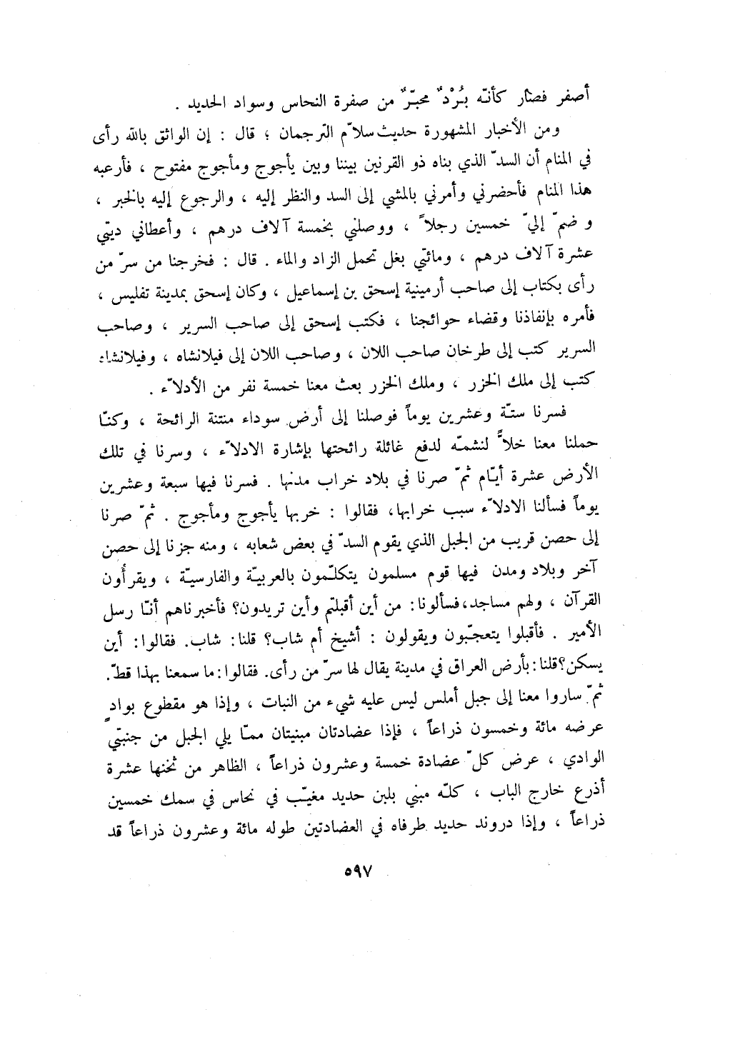فسرنا ستة وعشرين يوماً فوصلنا إلى أرض سوداء منتنة الرائحة، وكنا حملنا معنا خلاً لنشمه لدفع غائلة رائحتها بإشارة الادلاء، وسرنا في تلك الأرض عشرة ايام ثم صرنا في بلاد خراب مدنها. فسرنا فيها سبعة وعشرين يوماً فسألنا الادلاء سبب خرابها، فقالوا: خربها يأجوج ومأجوج. ثم صرنا إلى حصن قريب من الجبل الذي يقوم السد في بعض شعابه، ومنه جزنا إلى حصن آخر وبلاد ومدن فيها قوم مسلمون يتكلمون بالعربية والفارسية، ويقرأون القرآن، ولهم مساجد، فسألونا: من أين أقبلتم وأين تريدون؟ فأخبرناهم أنا رسل الأمير. فأقبلوا يتعجبون ويقولون: أشيخ أم شاب؟ قلنا: شاب. فقالوا: أين يسكن؟ قلنا: بأرض العراق في مدينة يقال لها سر من رأى. فقالوا: ما سمعنا بهذا قط. ثم ساروا معنا إلى جبل أملس ليس عليه شيء من النبات، وإذا هو مقطوع بواد عرضه مائة وخمسون ذراعاً، فإذا عضادتان مبنيتان مما يلي الجبل من جنبتي الوادي، عرض كل عضادة خمسة وعشرون ذراعاً، الظاهر من ثخنها عشرة أذرع خارج الباب، كله مبني بلبن حديد مغيب في نحاس في سمك خمسين ذراعاً، وإذا دروند حديد طرفاه في العضادتين طوله مائة وعشرون ذراعاً قد