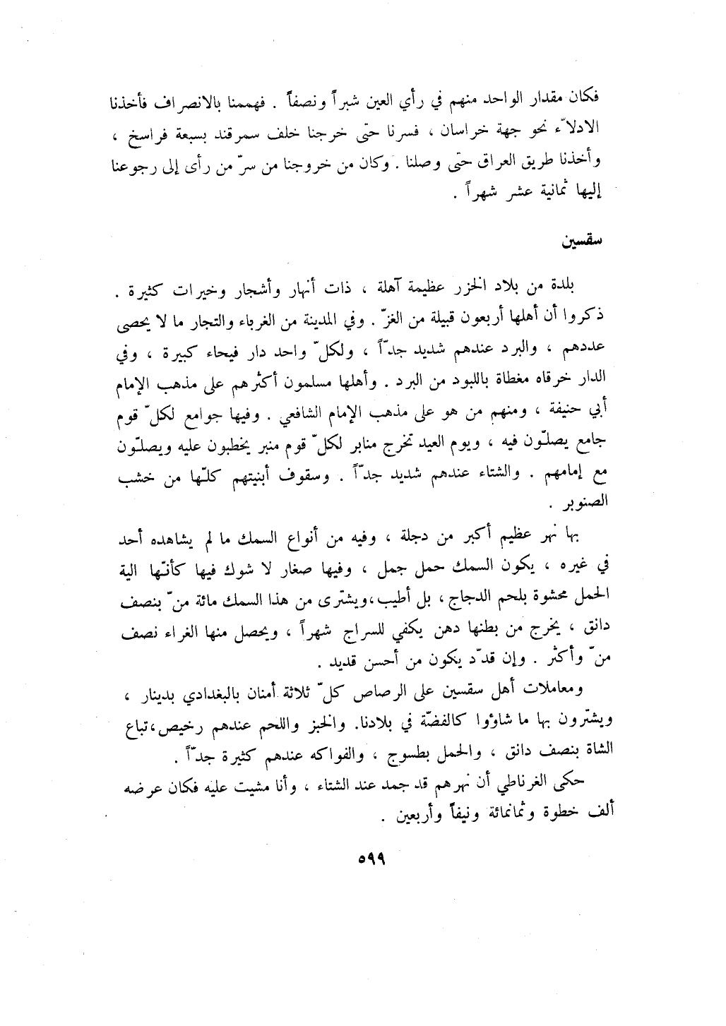 ومعاملات أهل سقسين على الرصاص كل ثلاثة أمنان بالبغدادي بدينار، ويشترون بها ما شاؤوا كالفضة في بلادنا. والخبز واللحم عندهم رخيص، تباع الشاة بنصف دانق، والحمل بطسوج، والفواكه عندهم كثيرة جداً.