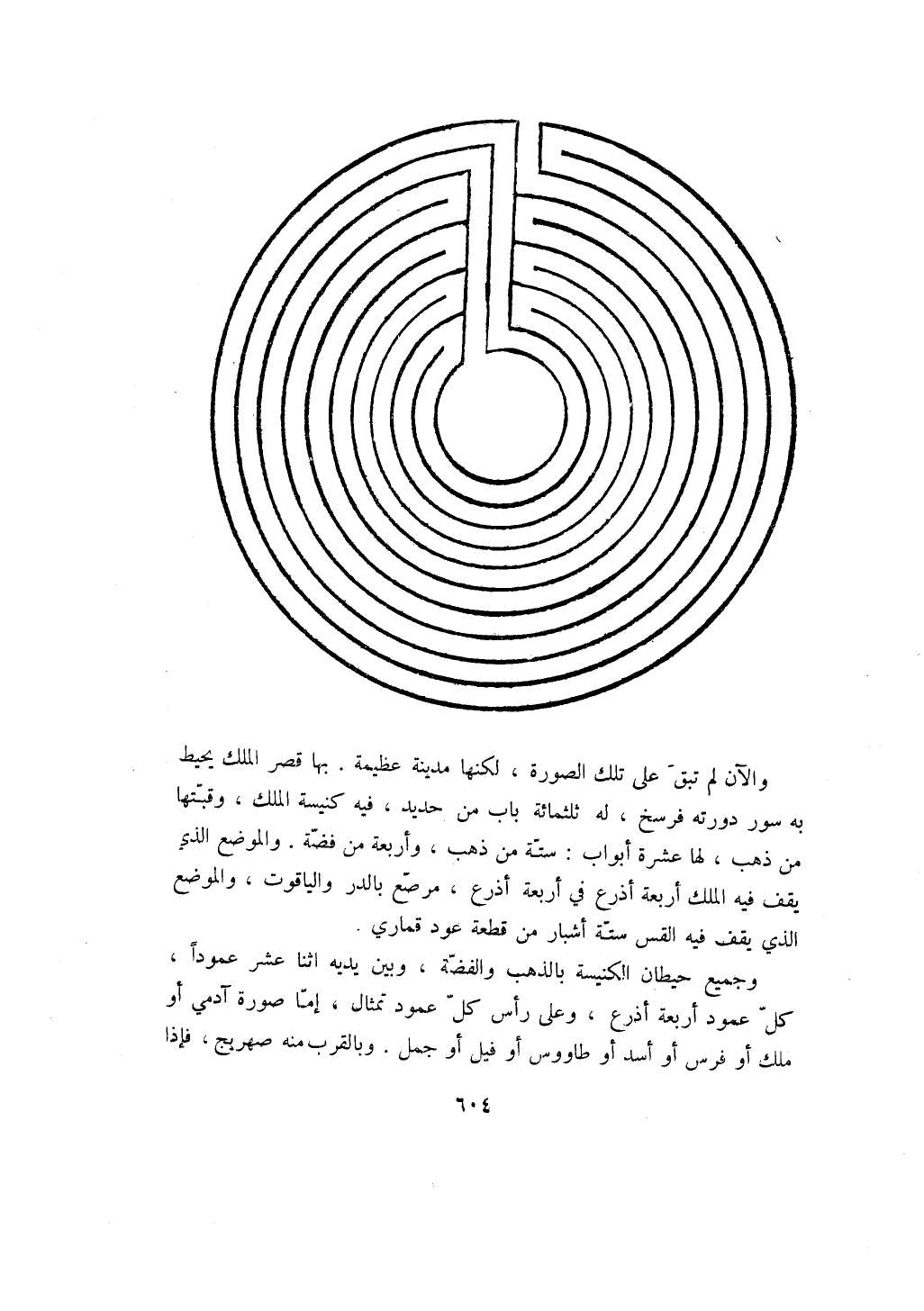 وجميع حيطان الكنيسة بالذهب والفضة، وبين يديه اثنا عشر عموداً، كل عمود أربعة أذرع، وعلى رأس كل عمود تمثال، إما صورة آدمي أو ملك أو فرس أو أسد أو طاووس أو فيل أو جمل. وبالقرب منه صهريج، فإذا