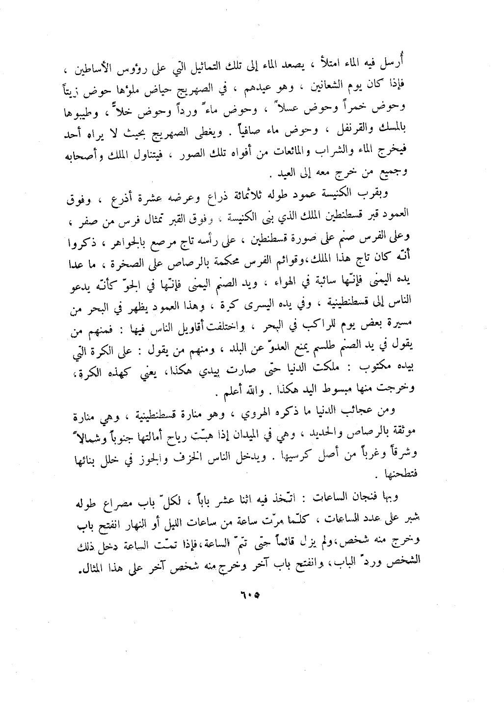 وبقرب الكنيسة عمود طوله ثلاثمائة ذراع وعرضه عشرة أذرع، وفوق العمود قبر قسطنطين الملك الذي بنى الكنيسة، وفوق القبر تمثال فرس من صفر، وعلى الفرس صنم على صورة قسطنطين، على رأسه تاج مرصع بالجواهر، ذكروا أنه كان تاج هذا الملك، وقوائم الفرس محكمة بالرصاص على الصخرة، ما عدا يده اليمنى فإنها سائبة في الهواء، ويد الصنم اليمنى فإنها في الجو كأنه يدعو الناس إلى قسطنطينية، وفي يده اليسرى كرة، وهذا العمود يظهر في البحر من مسيرة بعض يوم للراكب في البحر، واختلفت أقاويل الناس فيها: فمنهم مني قول في يد الصنم طلسم يمنع العدو عن البلد، ومنهم من يقول: على الكرة التي بيده مكتوب: ملكت الدنيا حتى صارت بيدي هكذا، يعني كهذه الكرة، وخرجت منها مبسوط اليد هكذا. والله أعلم.