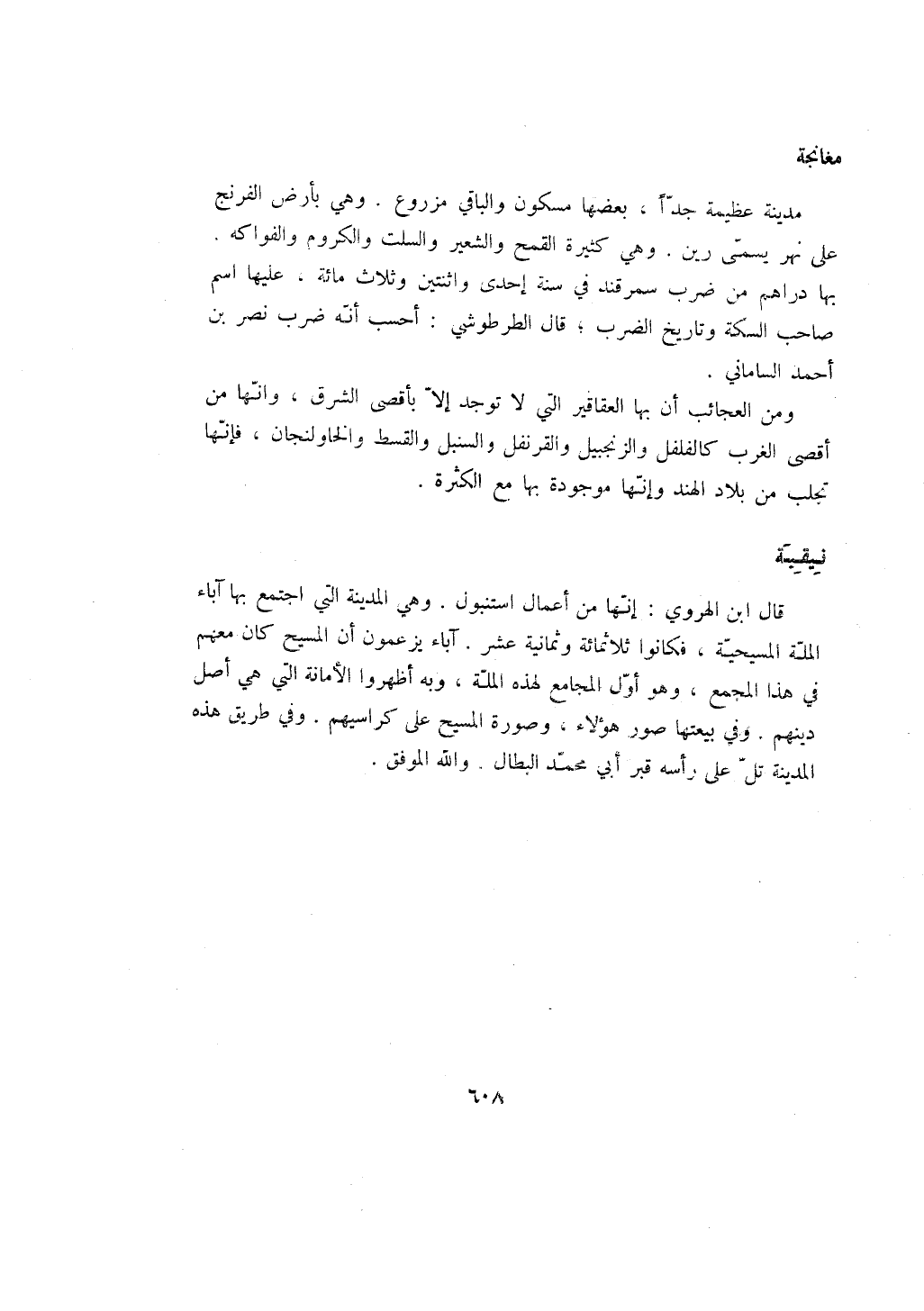 قال ابن الهروي: إنها من أعمال استنبول. وهي المدينة التي اجتمع بها آباء الملة المسيحية، فكانوا ثلاثمائة وثمانية عشر. آباء يزعمون أن المسيح كان معهم في هذا المجمع، وهو أول المجامع لهذه الملة، وبه أظهروا الأمانة التي هي أصل دينهم. وفي بيعتها صور هؤلاء، وصورة المسيح على كراسيهم. وفي طريق هذه المدينة تل على رأسه قبر أبي محمد البطال. والله الموفق.