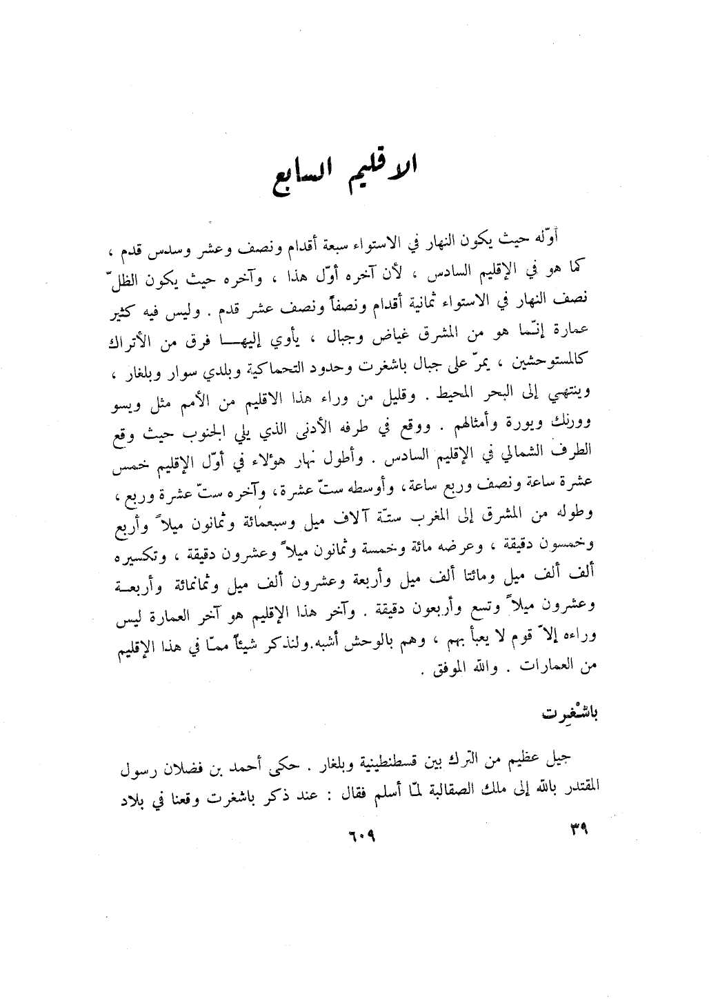 أوله حيث يكون النهار في الاستواء سبعة أقدام ونصف وعشر وسدس قدم، كما هو في الإقليم السادس، لأن آخره أول هذا، وآخره حيث يكون الظل نصف النهار في الاستواء ثمانية أقدام ونصفاً ونصف عشر قدم. وليس فيه كثير عمارة إنما هو من المشرق غياض وجبال، يأوي إليها فرق من الأتراك كالمستوحشين، يمر على جبال باشغرت وحدود التحماكية وبلدي سوار وبلغار، وينتهي إلى البحر المحيط. وقليل من وراء هذا الاقليم من الأمم مثل ويسو وورنك ويورة وأمثالهم. ووقع في طرفه الأدنى الذي يلي الجنوب حيث وقع الطرف الشمالي في الإقليم السادس. وأطول نهار هؤلاء في أول الإقليم خمس عشرة ساعة ونصف وربع ساعة، وأوسطه ست عشرة، وآخره ست عشرة وربع، وطوله من المشرق إلى المغرب ستة آلاف ميل وسبعمائة وثمانون ميلاً وأربع وخمسون دقيقة، وعرضه مائة وخمسة وثمانون ميلاً وعشرون دقيقة، وتكسيره ألف ألف ميل ومائتا ألف ميل وأربعة وعشرون ألف ميل وثمانمائة وأربعة وعشرون ميلاً وتسع وأربعون دقيقة. وآخر هذا الإقليم هو آخر العمارة ليس وراءه إلا قوم لا يعبأ بهم، وهم بالوحش أشبه. ولنذكر شيئاً مما في هذا الإقليم من العمارات. والله الموفق.