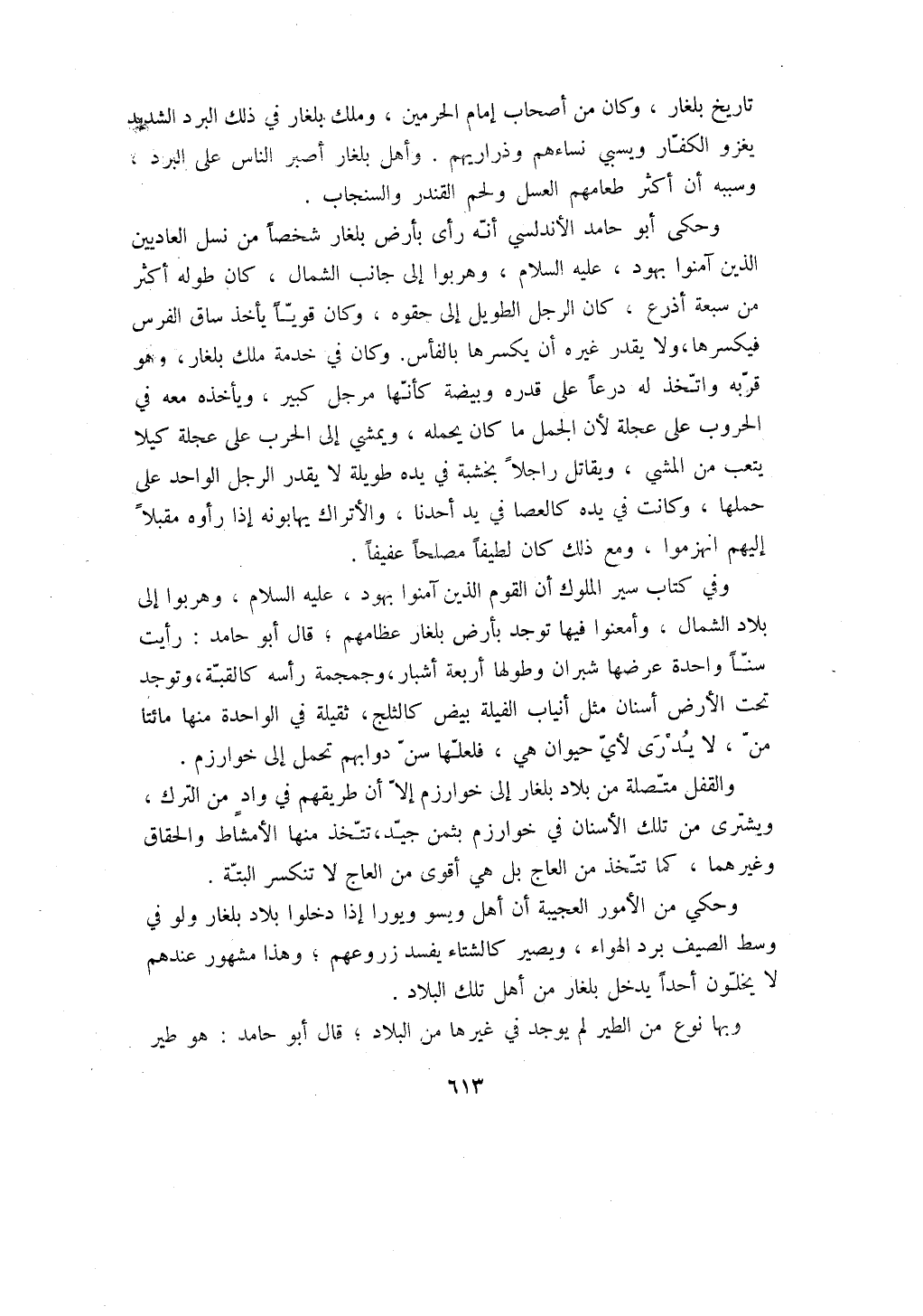 تاريخ بلغار، وكان من أصحاب إمام الحرمين، وملك بلغار في ذلك البرد الشديد يغزو الكفار ويسبي نساءهم وذراريهم. وأهل بلغار أصبر الناس على البرد، وسببه أن أكثر طعامهم العسل ولحم القندر والسنجاب.