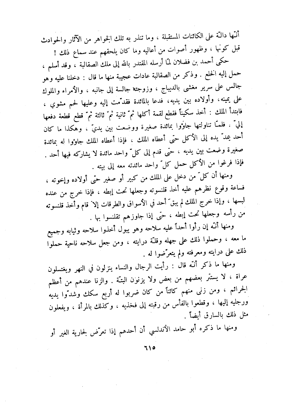 أنها دالة على الكائنات المستقبلة، وما تنذر به تلك الجواهر من الآثار والحوادث قبل كونها، وظهور أصوات من أعاليه وما كان يلحقهم عند سماع ذلك! حكى أحمد بن فضلان لما أرسله المقتدر بالله إلى ملك الصقالبة، وقد أسلم، حمل إليه الخلع. وذكر من الصقالبة عادات عجيبة منها ما قال: دخلنا عليه وهو جالس على سرير مغشى بالديباج، وزوجته جالسة إلى جانبه، والأمراء والملوك على يمينه، وأولاده بين يديه، فدعا بالمائدة فقدمت إليه وعليها لحم مشوي، فابتدأ الملك: أخذ سكيناً فقطع لقمة أكلها ثم ثانية ثم ثالثة ثم قطع قطعة دفعها إلي، فلما تناولتها جاؤوا بمائدة صغيرة ووضعت بين يدي، وهكذا ما كان أحد يمد يده إلى الأكل حتى أعطاه الملك، فإذا أعطاه الملك جاؤوا له بمائدة صغيرة وضعت بين يديه، حتى قدم إلى كل واحد مائدة لا يشاركه فيها أحد. فإذا فرغوا من الأكل حمل كل واحد مائدته معه إلى بيته.