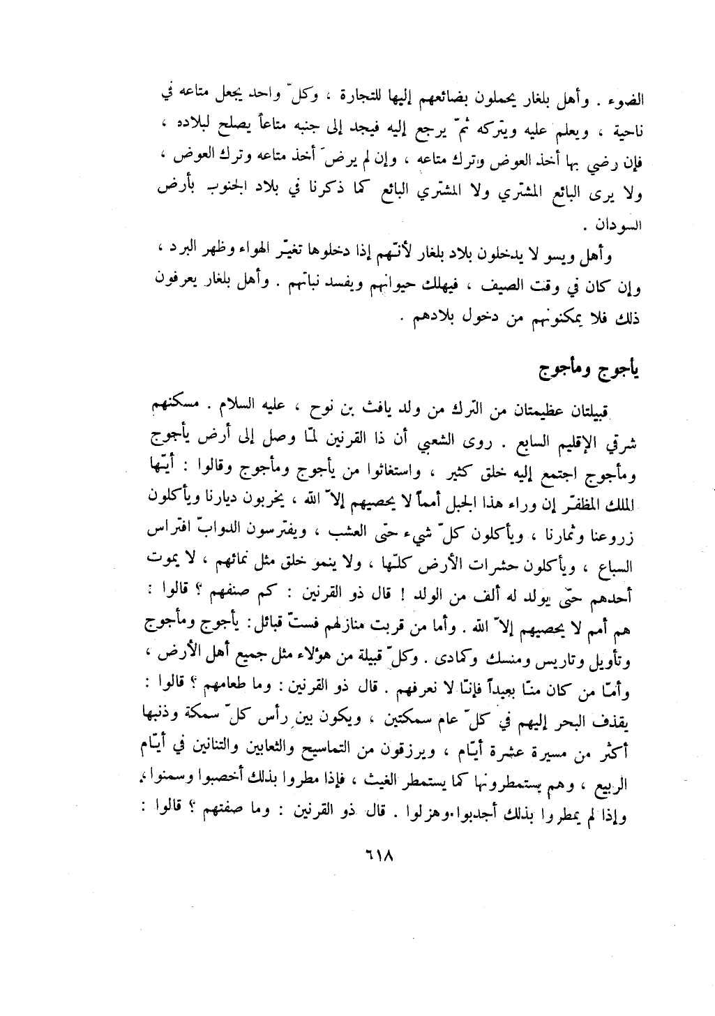 قبيلتان عظيمتان من الترك من ولد يافث بن نوح، عليه السلام. مسكنهم شرقي الإقليم السابع. روى الشعبي أن ذا القرنين لما وصل إلى أرض يأجوج ومأجوج اجتمع إليه خلق كثير، واستغاثوا من يأجوج ومأجوج وقالوا: أيها الملك المظفر إن وراء هذا الجبل أمماً لا يحصيهم إلا الله، يخربون ديارنا ويأكلون زروعنا وثمارنا، ويأكلون كل شيء حتى العشب، ويفترسون الدواب افتراس السباع، ويأكلون حشرات الأرض كلها، ولا ينمو خلق مثل نمائهم، لا يموت أحدهم حتى يولد له ألف من الولد! قال ذو القرنين: كم صنفهم؟ قالوا: هم أمم لا يحصيهم إلا الله. وأما من قربت منازلهم فست قبائل: يأجوج ومأجوج وتأويل وتاريس ومنسك وكمادى. وكل قبيلة من هؤلاء مثل جميع أهل الأرض، وأما من كان منا بعيداً فإنا لا نعرفهم. قال ذو القرنين: وما طعامهم؟ قالوا: يقذف البحر إليهم في كل عام سمكتين، ويكون بين رأس كل سمكة وذنبها أكثر من مسيرة عشرة أيام، ويرزقون من التماسيح والثعابين والتنانين في أيام الربيع، وهم يستمطرونها كما يستمطر الغيث، فإذا مطروا بذلك أخصبوا وسمنوا؛ وإذا لم يمطروا بذلك أجدبوا وهزلوا. قال ذو القرنين: وما صفتهم؟ قالوا:
