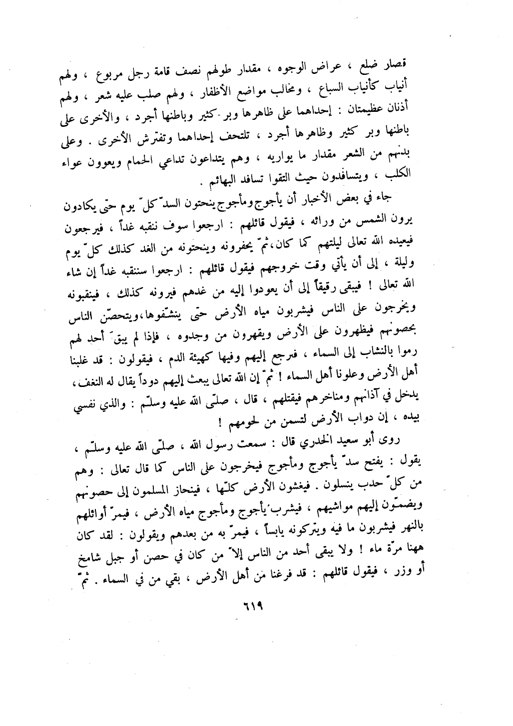 جاء في بعض الأخبار أن يأجوج ومأجوج ينحتون السد كل يوم حتى يكادون يرون الشمس من ورائه، فيقول قائلهم: ارجعوا سوف ننقبه غداً، فيرجعون فيعيده الله تعالى ليلتهم كما كان، ثم يحفرونه وينحتونه من الغد كذلك كل يوم وليلة، إلى أن يأتي وقت خروجهم فيقول قائلهم: ارجعوا سننقبه غداً إن شاء الله تعالى! فيبقى رقيقاً إلى أن يعودوا إليه من غدهم فيرونه كذلك، فينقبونه ويخرجون على الناس فيشربون مياه الأرض حتى ينشفوها، ويتحصن الناس بحصونهم فيظهرون على الأرض ويقهرون من وجدوه، فإذا لم يبق أحد لهم رموا بالنشاب إلى السماء، فيرجع إليهم وفيها كهيئة الدم، فيقولون: قد غلبنا أهل الأرض وعلونا أهل السماء! ثم إن الله تعالى يبعث إليهم دوداً يقال له النغف، يدخل في آذانهم ومناخرهم فيقتلهم، قال، صلى الله عليه وسلم: والذي نفسي بيده، إن دواب الأرض لتسمن من لحومهم! روى أبو سعيد الخدري قال: سمعت رسول الله، صلى الله عليه وسلم، يقول: يفتح سد يأجوج ومأجوج فيخرجون على الناس كما قال تعالى: وهم من كل حدب ينسلون. فيغشون الأرض كلها، فينحاز المسلمون إلى حصونهم ويضمون إليهم مواشيهم، فيشرب يأجوج ومأجوج مياه الأرض، فيمر أوائلهم بالنهر فيشربون ما فيه ويتركونه يابساً، فيمر به من بعدهم ويقولون: لقد كان ههنا مرة ماء! ولا يبقى أحد من الناس إلا من كان في حصن أو جبل شامخ أو وزر، فيقول قائلهم: قد فرغنا من أهل الأرض، بقي من في السماء. ثم