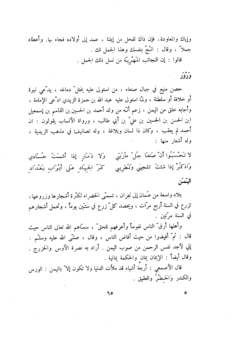 وأهلها أرق الناس نفوساً وأعرفهم للحق، سماهم الله تعالى الناس حيث قال: ثم أفيضوا من حيث أفاض الناس، وقال، صلى الله عليه وسلم: إني لأجد نفس الرحمن من صوب اليمن. أراد به نصرة الأوس والخزرج. وقال أيضاً: الإيمان يمان والحكمة يمانية.