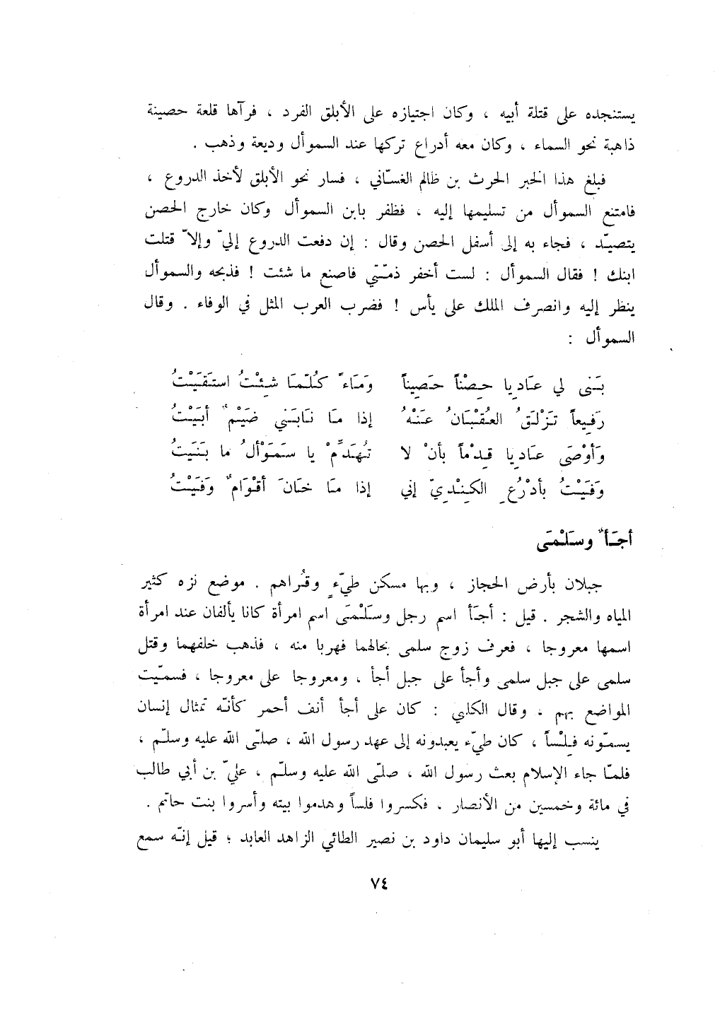 يستنجده على قتلة أبيه، وكان اجتيازه على الأبلق الفرد، فرآها قلعة حصينة ذاهبة نحو السماء، وكان معه أدراع تركها عند السموأل وديعة وذهب.