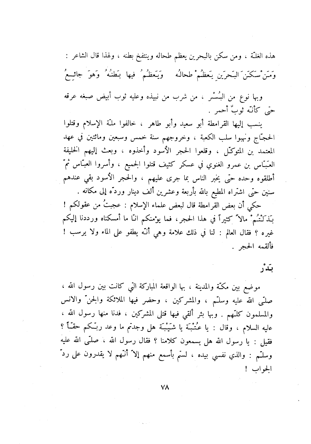 ينسب إليها القرامطة أبو سعيد وأبو طاهر، خالفوا ملة الإسلام وقتلوا الحجاج ونهبوا سلب الكعبة، وخروجهم سنة خمس وسبعين ومائتين في عهد المعتمد بن المتوكل، وقلعوا الحجر الأسود وأخذوه، وبعث إليهم الخليفة العباس بن عمرو الغنوي في عسكر كثيف قتلوا الجميع، وأسروا العباس ثم أطلقوه وحده حتى يخبر الناس بما جرى عليهم، والحجر الأسود بقي عندهم سنين حتى اشتراه المطيع بالله بأربعة وعشرين ألف دينار ورده إلى مكانه.