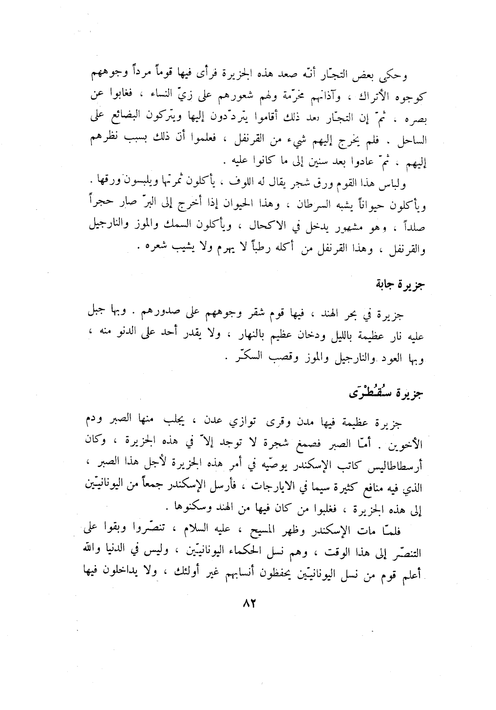 جزيرة عظيمة فيها مدن وقرى توازي عدن، يجلب منها الصبر ودم الأخوين، أما الصبر فصمغ شجرة لا توجد إلا في هذه الجزيرة، وكان أرسطاطاليس كاتب الإسكندر يوصيه في أمر هذه الجزيرة لأجل هذا الصبر، الذي فيه منافع كثيرة سيما في الايارجات، فأرسل الإسكندر جمعاً من اليونانيتين إلى هذه الجزيرة، فغلبوا من كان فيها من الهند وسكنوها.