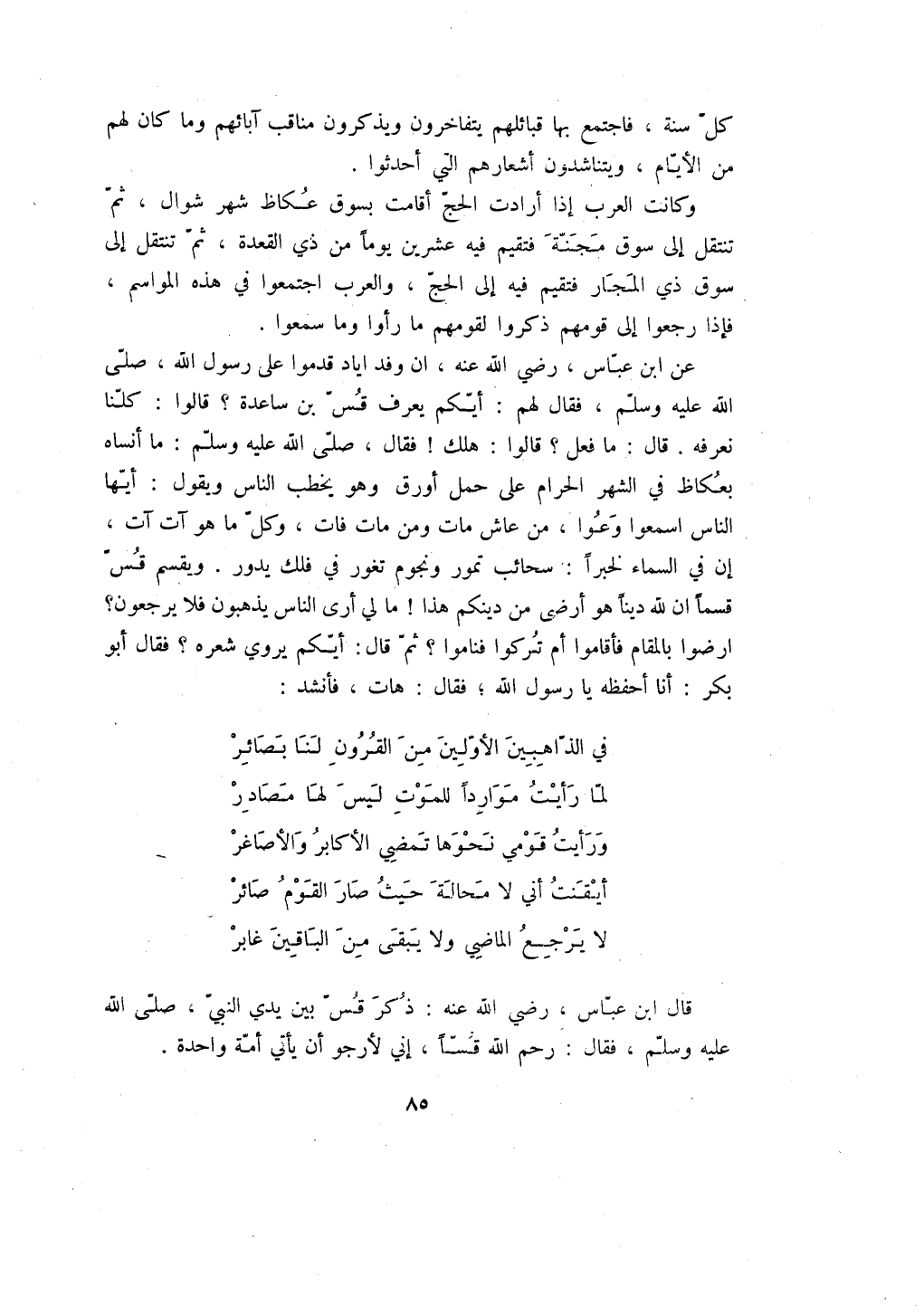 عن ابن عباس، رضي الله عنه، ان وفد اياد قدموا على رسول الله، صلى الله عليه وسلم، فقال لهم: أيكم يعرف قس بن ساعدة؟ قالوا: كلنا نعرفه. قال: ما فعل؟ قالوا: هلك! فقال، صلى الله عليه وسلم: ما أنساه بعكاظ في الشهر الحرام على حمل أورق وهو يخطب الناس ويقول: أيها الناس اسمعوا وعوا، من عاش مات ومن مات فات، وكل ما هو آت آت، إن في السماء لخبراً: سحائب تمور ونجوم تغور في فلك يدور. ويقسم قس قسماً ان لله ديناً هو أرضى من دينكم هذا! ما لي أرى الناس يذهبون فلا يرجعون؟ ارضوا بالمقام فأقاموا أم تركوا فناموا؟ ثم قال: أيكم يروي شعره؟ فقال أبو بكر: أنا أحفظه يا رسول الله؛ فقال: هات، فأنشد: