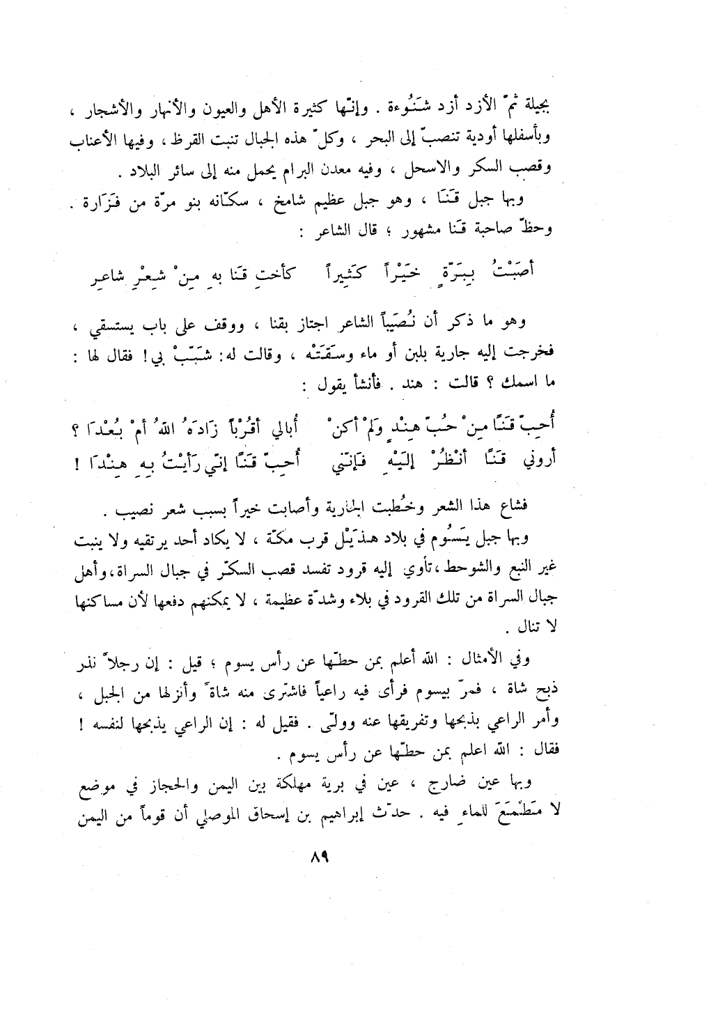 وبها جبل يسوم في بلاد هذيل قرب مكة، لا يكاد أحد يرتقيه ولا ينبت غير النبع والشوحط، تأوي إليه قرود تفسد قصب السكر في جبال السراة، وأهل جبال السراة من تلك القرود في بلاء وشدة عظيمة، لا يمكنهم دفعها لأن مساكنها لا تنال.