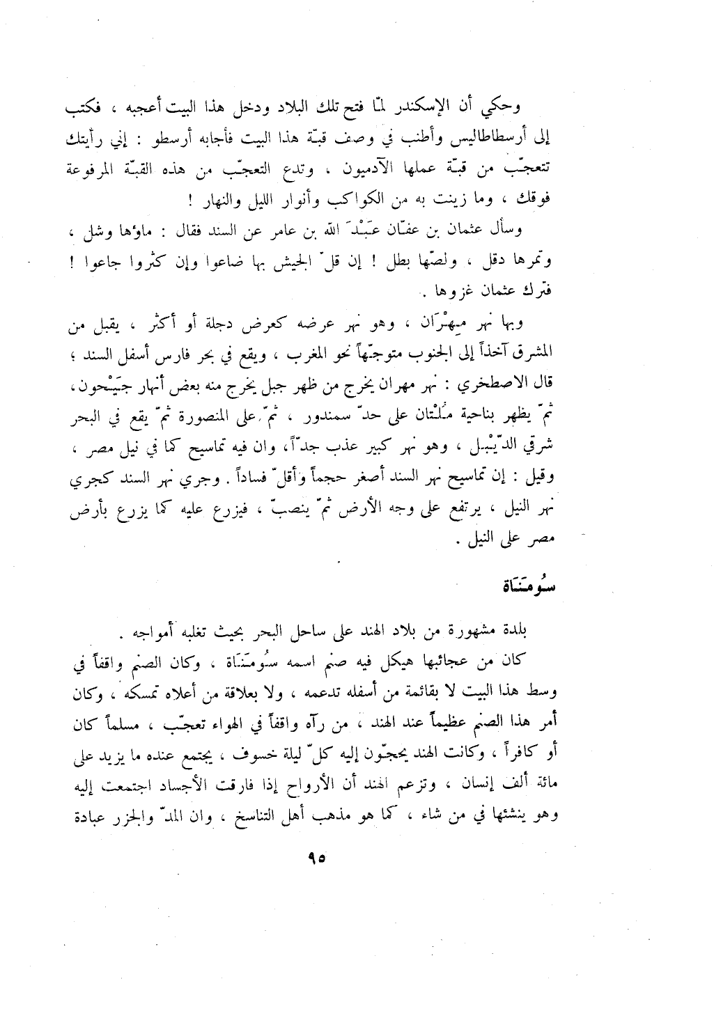 وحكي أن الإسكندر لما فتح تلك البلاد ودخل هذا البيت أعجبه، فكتب إلى أرسطاطاليس وأطنب في وصف قبة هذا البيت فأجابه أرسطو: إني رأيتك تتعجب من قبة عملها الآدميون، وتدع التعجب من هذه القبة المرفوعة فوقك، وما زينت به من الكواكب وأنوال الليل والنهار! وسأل عثمان بن عفان عبد الله بن عامر عن السند فقال: ماؤها وشل، وتمرها دقل، ولصها بطل! إن قل الجيش بها ضاعوا وإن كثروا جاعوا! فترك عثمان غزوها.