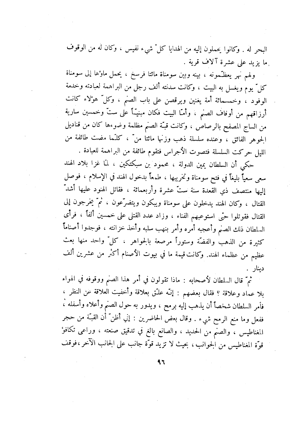 حكي أن السلطان يمين الدولة، محمود بن سبكتكين، لما غزا بلاد الهند سعى سعياً بليغاً في فتح سومناة وتخريبها، طمعاً بدخول الهند في الإسلام، فوصل إليها منتصف ذي القعدة سنة ست عشرة وأربعمائة، فقاتل الهنود عليها أشد القتال، وكان الهند يدخلون على سومناة ويبكون ويتضرعون، ثم يخرجون إلى القتال فقوتلوا حتى استوعبهم الفناء، وزاد عدد القتلى على خمسين ألفاً، فرأى السلطان ذلك الصنم وأعجبه أمره وأمر بنهب سلبه وأخذ خزانته، فوجدوا أصناماً كثيرة من الذهب والفضة وستوراً مرصعة بالجواهر، كل واحد منها بعث عظيم من عظماء الهند. وكانت قيمة ما في بيوت الأصنام أكثر من عشرين ألف دينار.