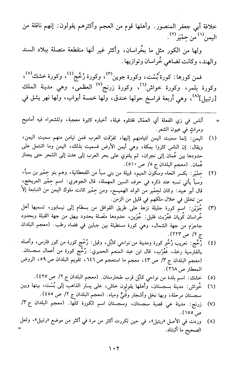 فمن كورها: كورة بست، وكورة جوين «3» ، وكورة رخّج «4» ، وكورة خشك «5» ، وكورة بلمر، وكورة خواش «6» ، وكورة زرنج «7» العظمى، وهي مدينة الملك [رتبيل] «8» ، وهي أربعة فراسخ حولها خندق، ولها خمسة أبواب، ولها نهر يشق في