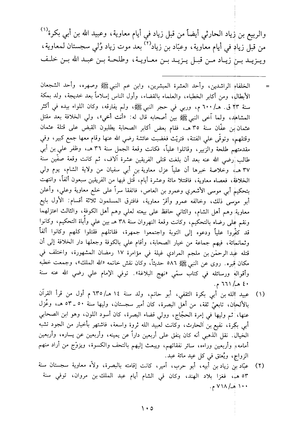 والربيع بن زياد الحارثي أيضا من قبل زياد في أيام معاوية، وعبيد الله بن أبي بكرة «1» من قبل زياد في أيام معاوية، وعبّاد بن زياد «2» بعد موت زياد ولي سجستان لمعاوية، ويزيد بن زياد من قبل يزيد بن معاوية، وطلحة بن عبد الله بن خلف