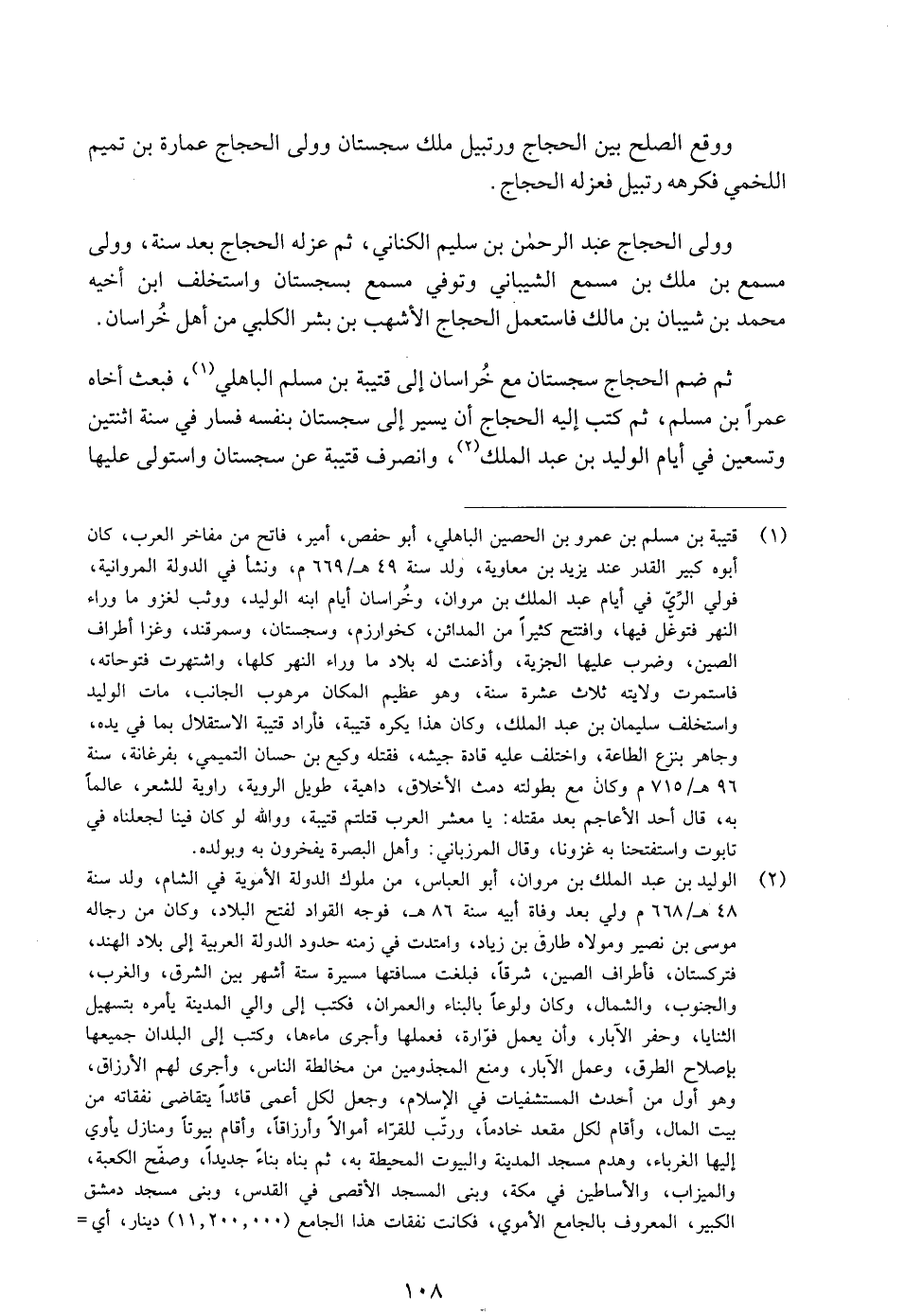 ثم ضم الحجاج سجستان مع خراسان إلى قتيبة بن مسلم الباهلي «1» ، فبعث أخاه عمرا بن مسلم، ثم كتب إليه الحجاج أن يسير إلى سجستان بنفسه فسار في سنة اثنتين وتسعين في أيام الوليد بن عبد الملك «2» ، وانصرف قتيبة عن سجستان واستولى عليها