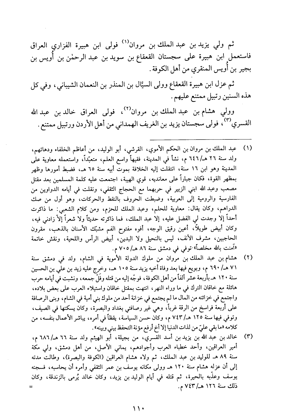 وولى هشام بن عبد الملك بن مروان «2» ، فولى العراق خالد بن عبد الله القسري «3» ، فولى سجستان يزيد بن الغريف الهمداني من أهل الأردن ورتبيل ممتنع.