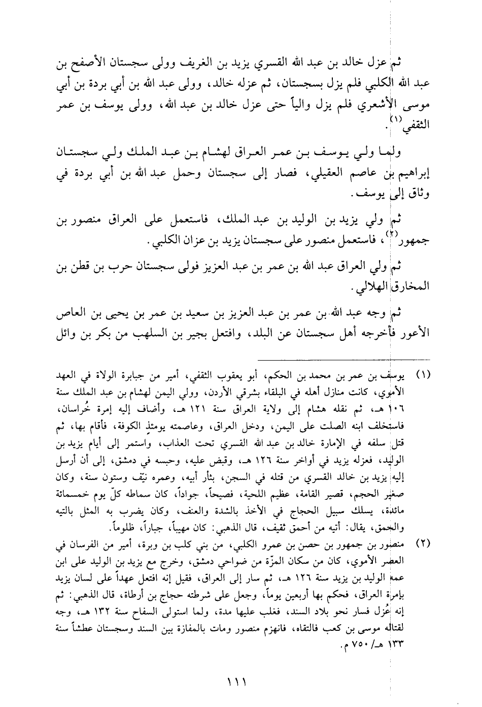 ثم عزل خالد بن عبد الله القسري يزيد بن الغريف وولى سجستان الأصفح بن عبد الله الكلبي فلم يزل بسجستان، ثم عزله خالد، وولى عبد الله بن أبي بردة بن أبي موسى الأشعري فلم يزل واليا حتى عزل خالد بن عبد الله، وولى يوسف بن عمر الثقفي «1» .