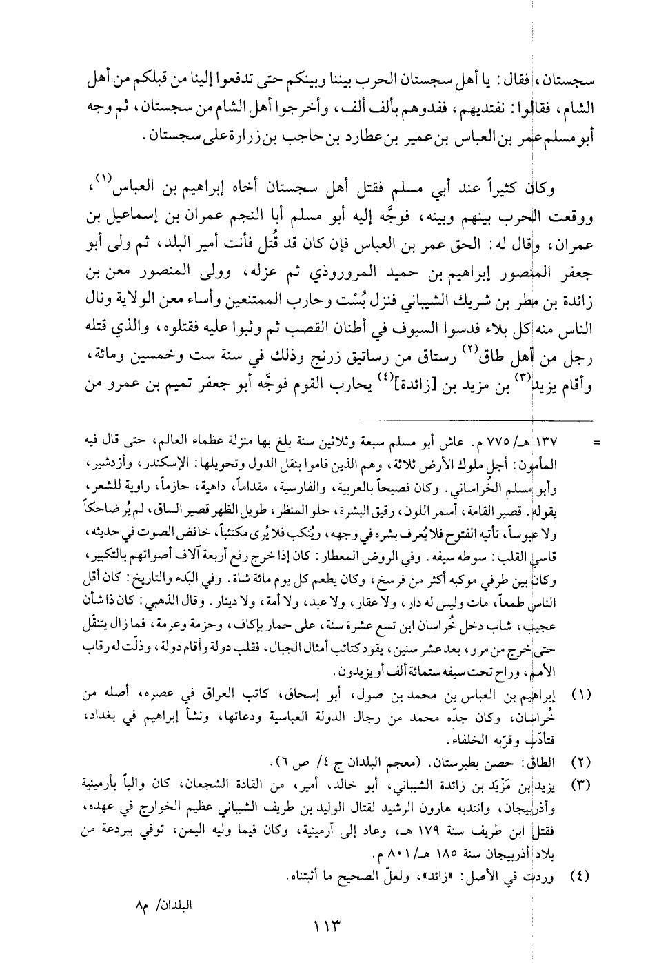 سجستان، فقال: يا أهل سجستان الحرب بيننا وبينكم حتى تدفعوا إلينا من قبلكم من أهل الشام، فقالوا: نفتديهم، ففدوهم بألف ألف، وأخرجوا أهل الشام من سجستان، ثم وجه أبو مسلم عمر بن العباس بن عمير بن عطارد بن حاجب بن زرارة على سجستان.