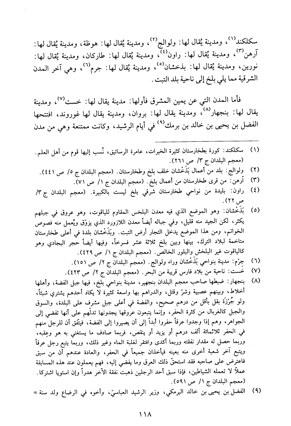 نورين، ومدينة يقال لها: بذخشان «5» ، ومدينة يقال لها: جرم «6» ، وهي آخر المدن الشرقية مما يلي بلخ إلى ناحية بلد التبت.