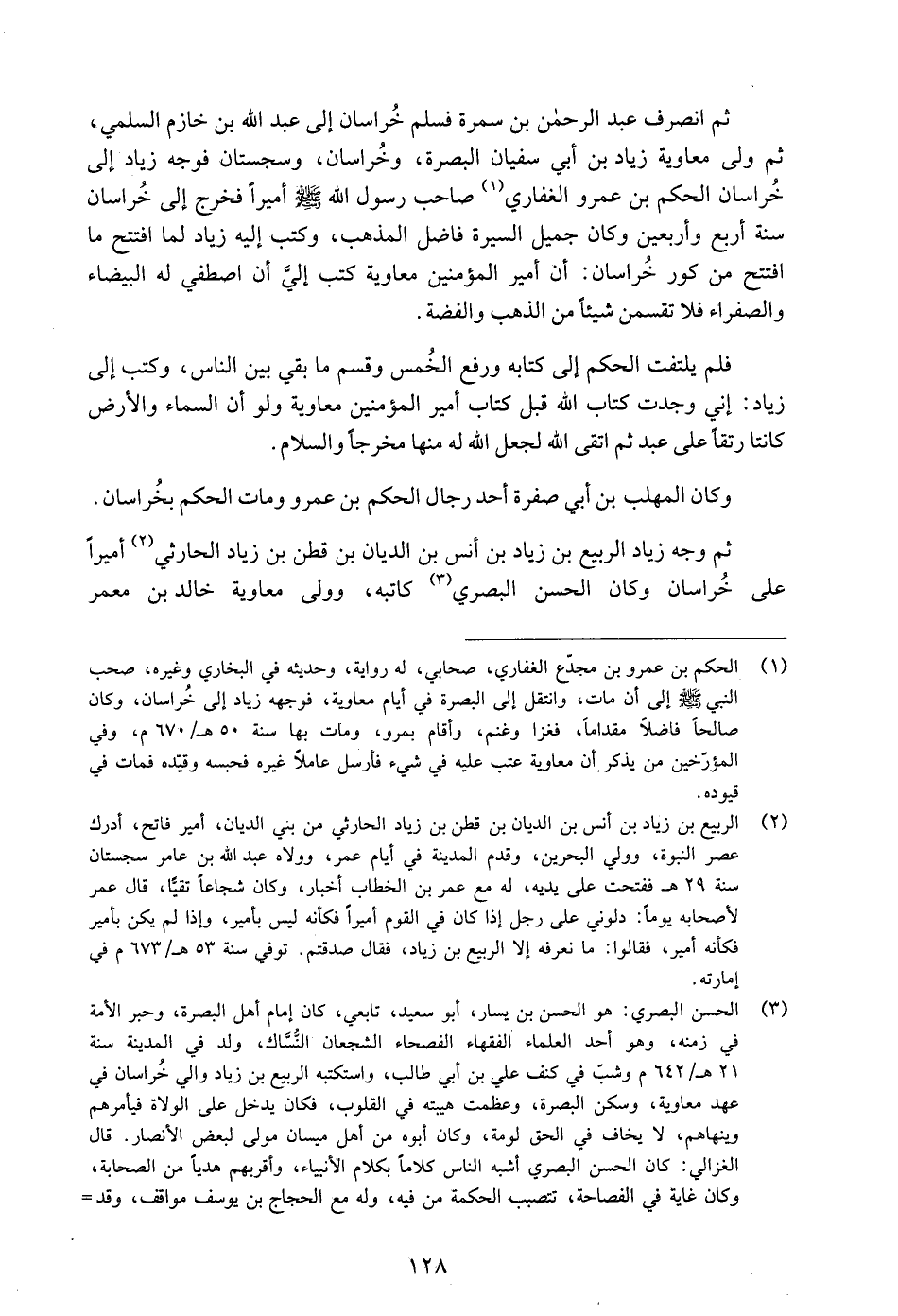 ثم انصراف عبد الرحمن بن سمرة فسلم خراسان إلى عبد الله بن خازم السلمي، ثم ولى معاوية زياد بن أبي سفيان البصرة، وخراسان، وسجستان فوجه زياد إلى خراسان الحكم بن عمرو الغفاري «1» صاحب رسول الله صلّى الله عليه وسلّم أميرا فخرج إلى خراسان سنة أربع وأربعين وكان جميل السيرة فاضل المذهب، وكتب إليه زياد لما افتتح ما افتتح من كور خراسان: أن أمير المؤمنين معاوية كتب إليّ أن اصطفي له البيضاء والصفراء فلا تقسمن شيئا من الذهب والفضة.