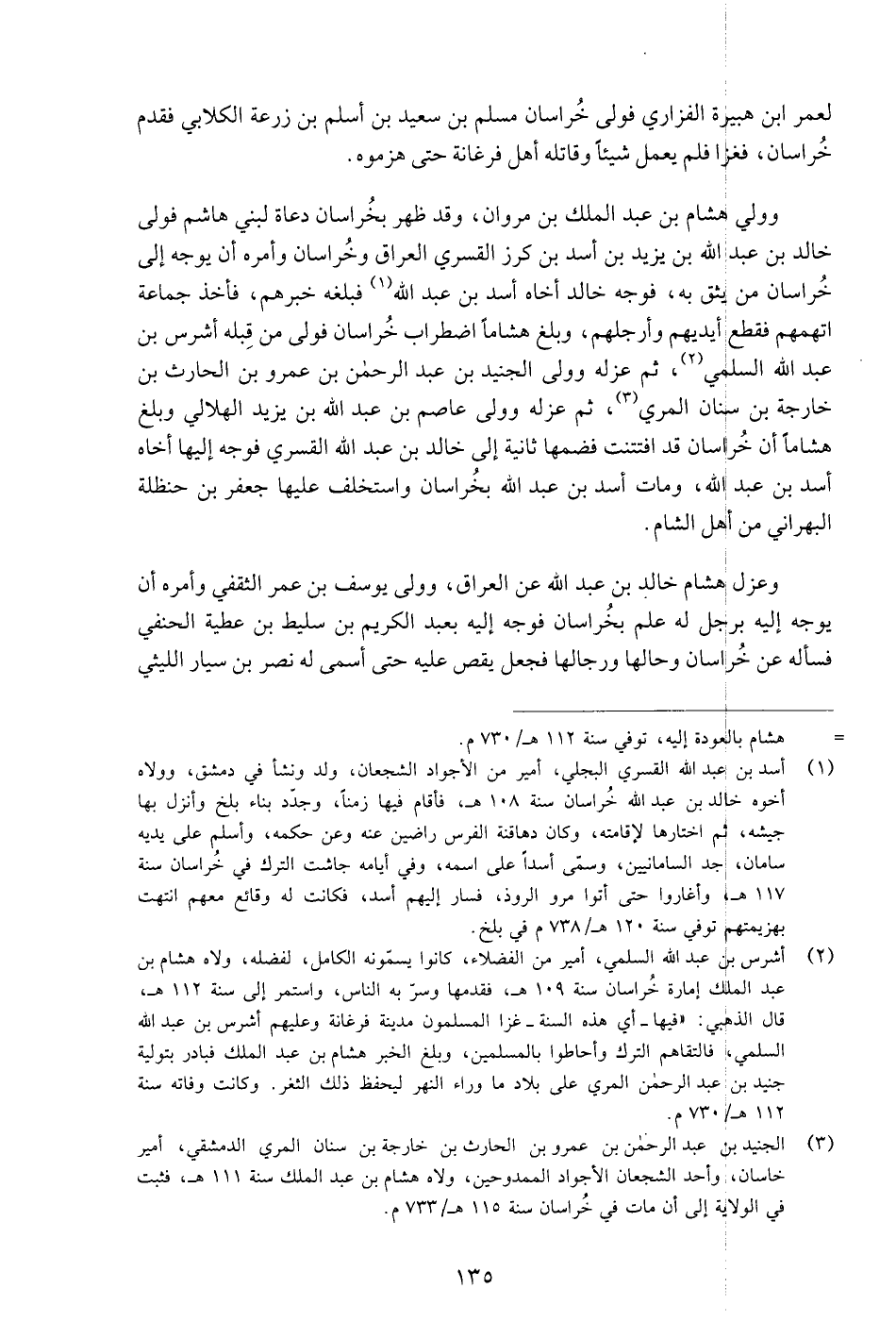 وولي هشام بن عبد الملك بن مروان، وقد ظهر بخراسان دعاة لبني هاشم فولى خالد بن عبد الله بن يزيد بن أسد بن كرز القسري العراق وخراسان وأمره أن يوجه إلى خراسان من يثق به، فوجه خالد أخاه أسد بن عبد الله «1» فبلغه خبرهم، فأخذ جماعة اتهمهم فقطع أيديهم وأرجلهم، وبلغ هشاما اضطراب خراسان فولى من قبله أشرس بن عبد الله السلمي «2» ، ثم عزله وولى الجنيد بن عبد الرحمن بن عمرو بن الحارث بن خارجة بن سنان المري «3» ، ثم عزله وولى عاصم بن عبد الله بن يزيد الهلالي وبلغ هشاما أن خراسان قد افتتنت فضمها ثانية إلى خالد بن عبد الله القسري فوجه إليها أخاه أسد بن عبد الله، ومات أسد بن عبد الله بخراسان واستخلف عليها جعفر بن حنظلة البهراني من أهل الشام.