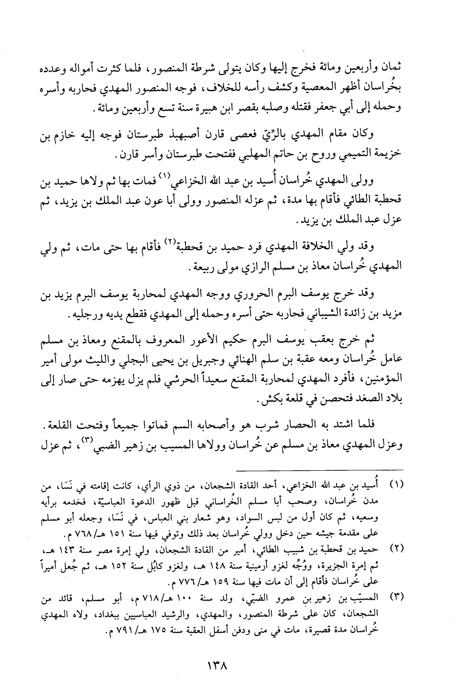 وقد ولي الخلافة المهدي فرد حميد بن قحطبة «2» فأقام بها حتى مات، ثم ولي المهدي خراسان معاذ بن مسلم الرازي مولى ربيعة.